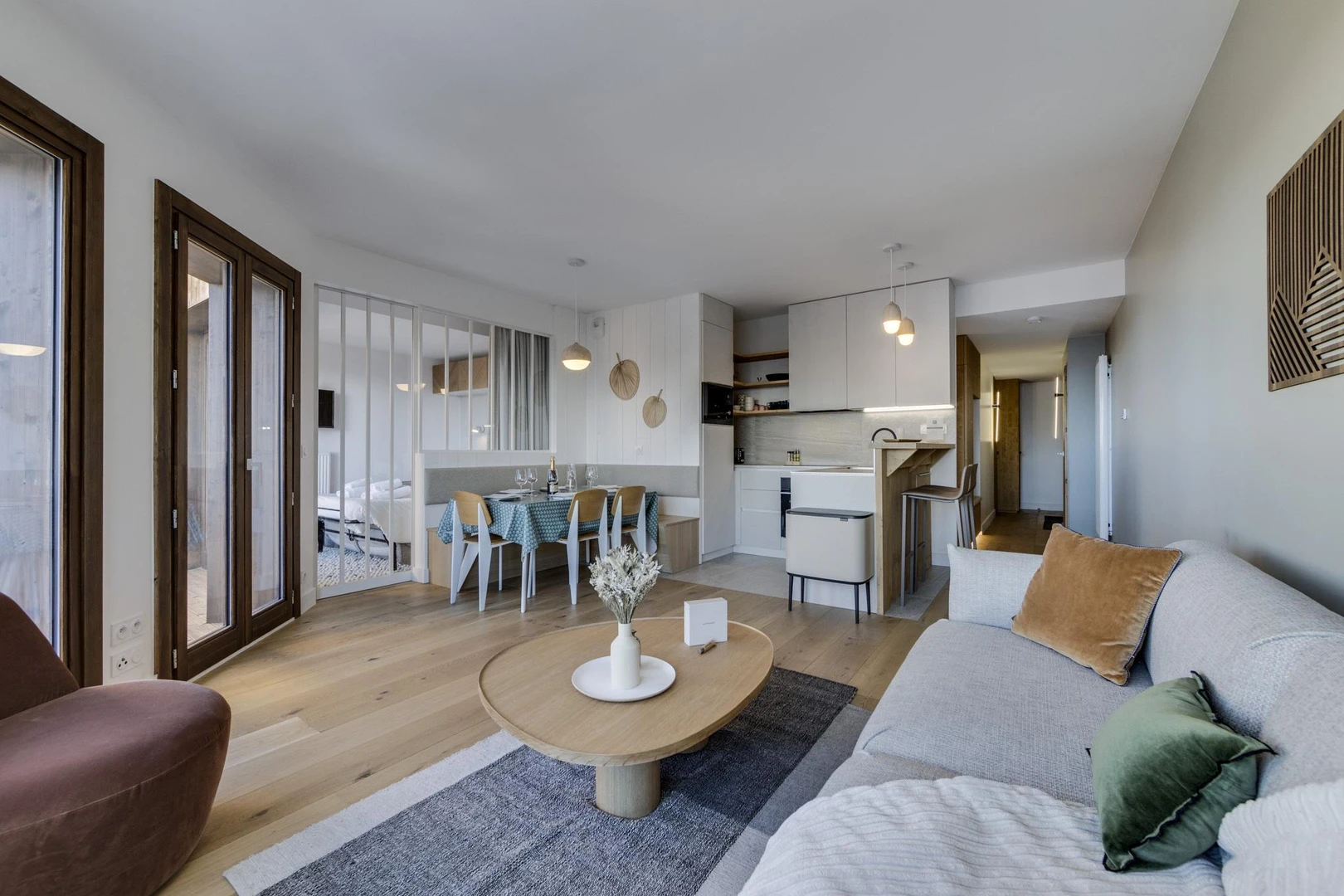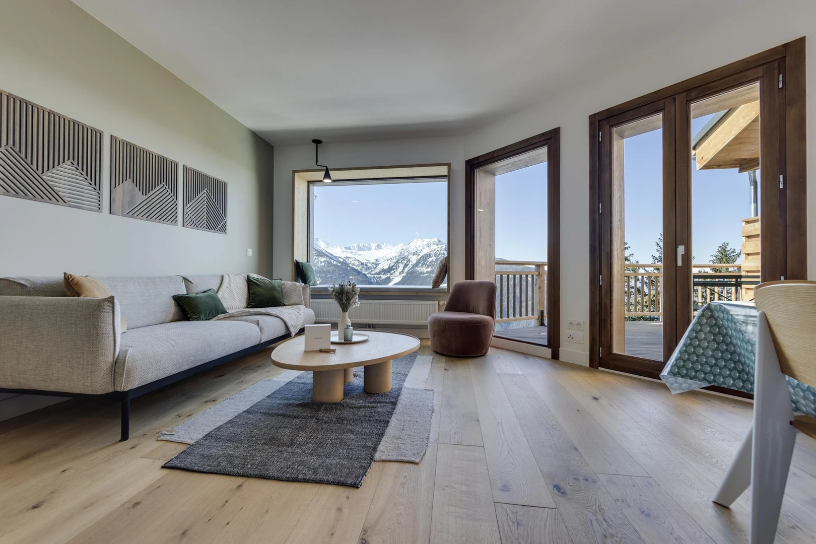 This 70 m² apartment blends refined décor with a Scandinavian touch, creating a warm and inviting atmosphere. It offers two bedrooms, including a dormitory for four, a shower room with toilets, a cabin area with a sofa bed opening onto the balcony, and a fully equipped kitchen connected to the living room. A spacious balcony benefits from exceptional sunshine and panoramic views, perfect for moments of relaxation after skiing.