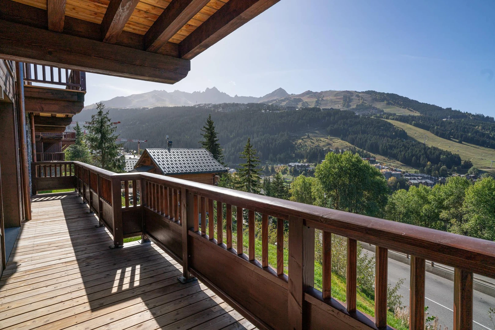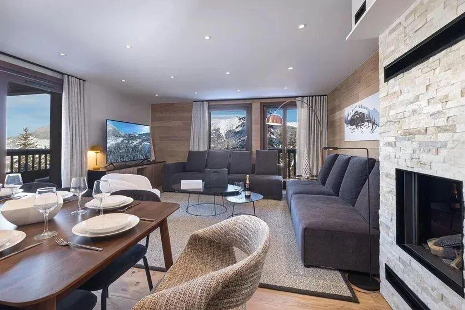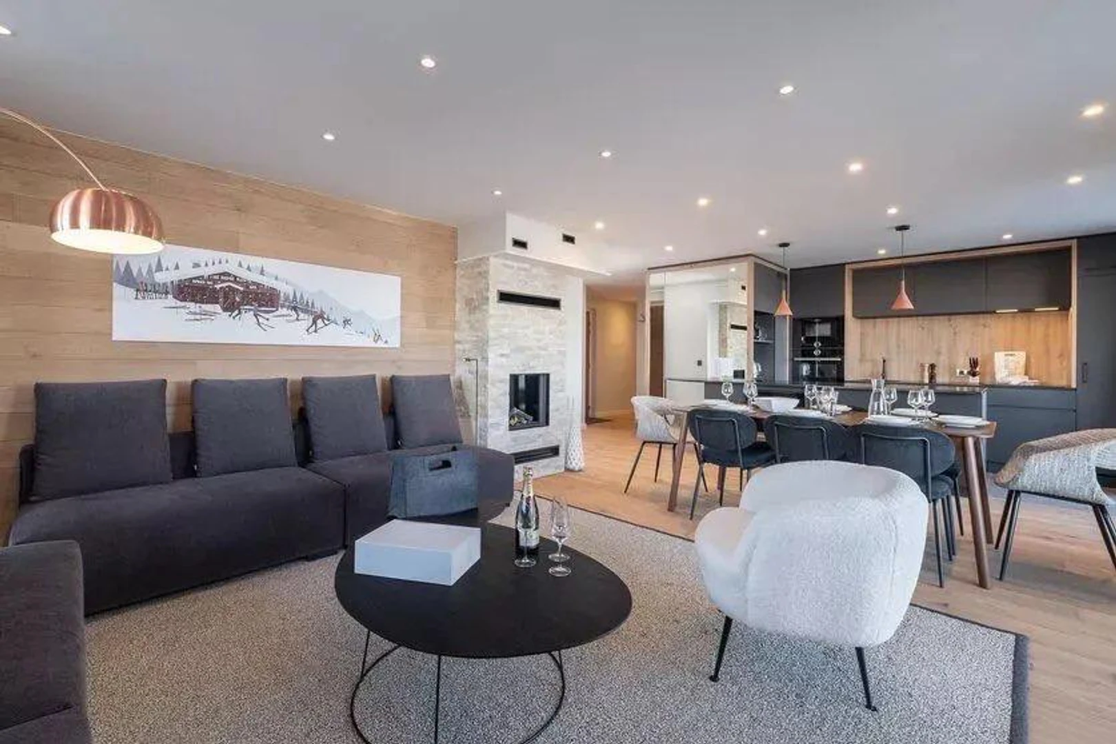 The heart of the apartment is the inviting living area, featuring a modern open-plan kitchen, a spacious dining table, and a cozy lounge. Relax by the gas fireplace set against a stunning stone wall, the perfect spot to unwind after a day on the slopes. Step out onto the multiple balconies to take in breathtaking views of the surrounding peaks. Whether you're enjoying your morning coffee or an après-ski drink, the alpine scenery is always in sight. The apartment combines elegant décor with high-end amenities and thoughtful services to ensure a seamless and luxurious mountain getaway. Conveniently located just 250 meters from the resort center and 450 meters from the snow front, you’ll have easy access to both the slopes and local attractions.