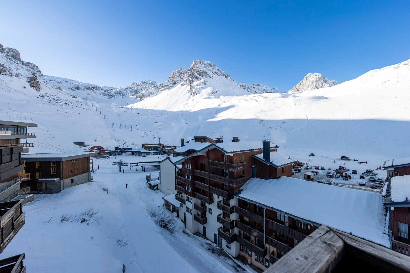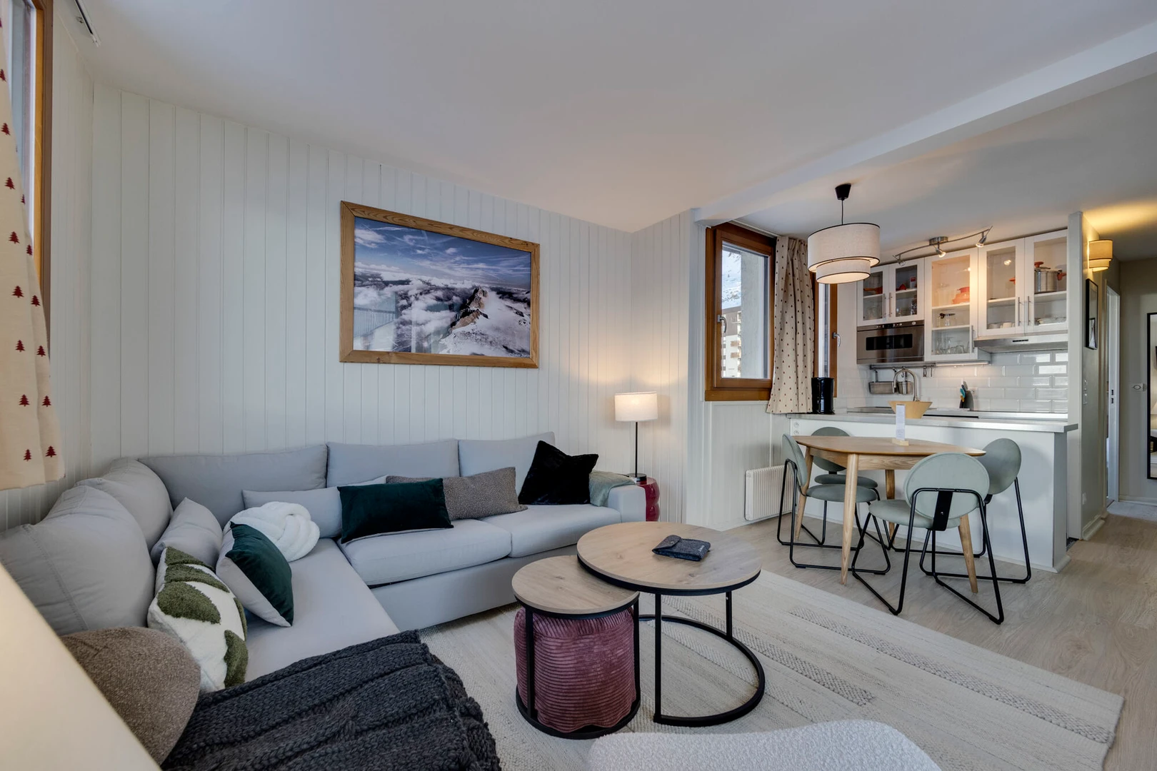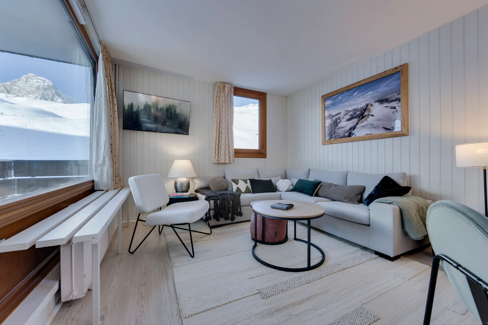 Perfect for up to 4 guests (2 adults and 2 children), the apartment features a bright, open living space with a fully equipped kitchen, dining area, and cozy lounge. The south-facing balcony boasts panoramic views of the iconic Grande Motte massif.