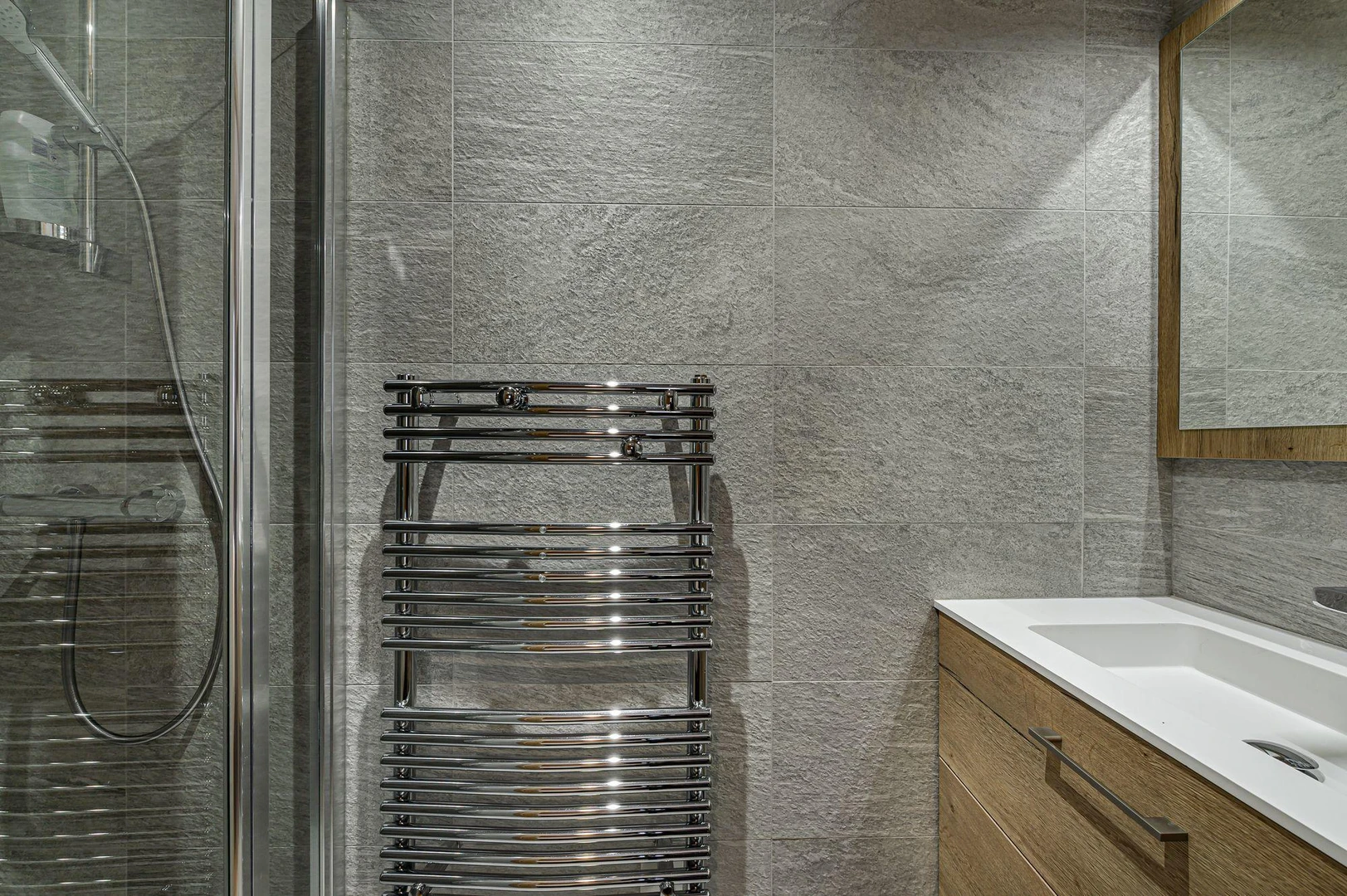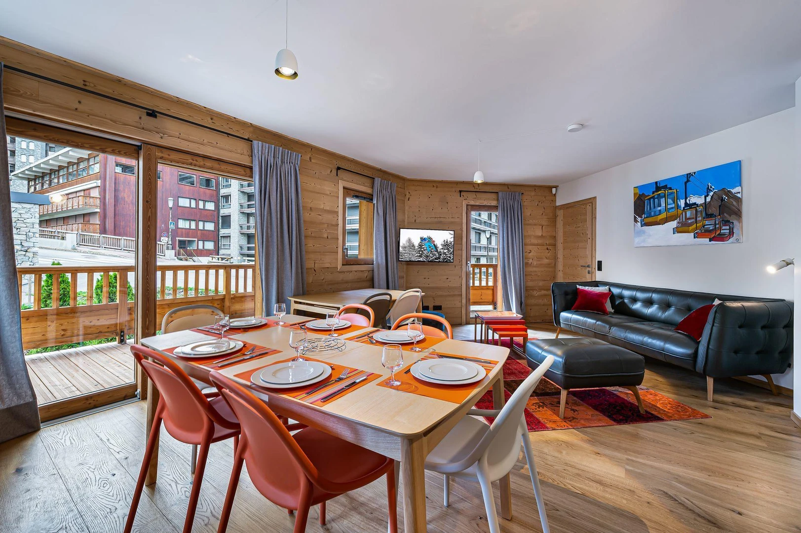Chantemerle 102 is a modern apartment with a warm, family-friendly ambiance. Its bright living space features an open-plan kitchen, dining area, and lounge. The south-east-facing terrace offers stunning views of the Alpine peaks.