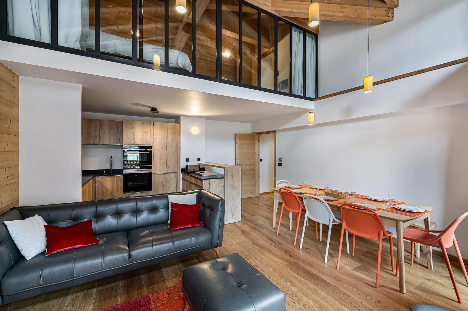 The open-plan living area, situated under the roof, is bright and spacious, with a lounge, dining area, and fully equipped kitchen. The contemporary design creates a warm and inviting atmosphere.
