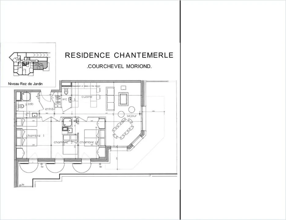 The Chantemerle RJ03 apartment features a spacious living room with an open, fully equipped kitchen, which flows into a cozy lounge with a TV and a dining area overlooking the garden. The apartment offers two large double bedrooms and a family room with a bunk bed and a double bed, making it perfect for both adults and children.