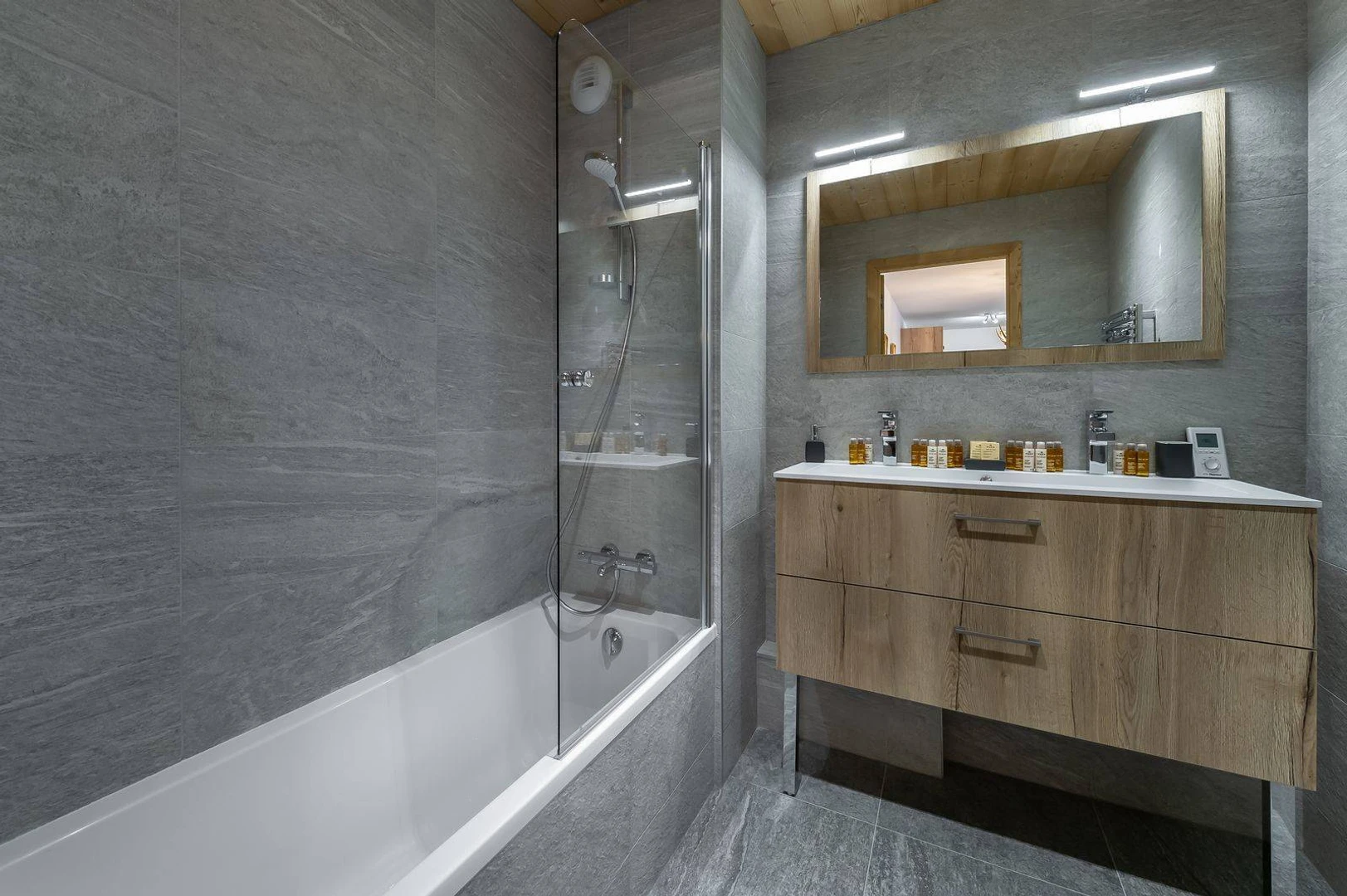 At the garden level of the residence, the Chantemerle RJ04 apartment accommodates up to 4 adults and 4 children in 78m² of space. The sleeping area includes 2 double bedrooms, one with an en-suite shower room, a cabin with 2 bunk beds, and a separate bathroom. The open-plan living area features a lounge, dining space, and fully-equipped kitchen, all leading to a terrace with beautiful views of the Alpine peaks. The interior seamlessly combines traditional mountain charm with modern comforts, with wood accents and soft materials creating a warm and relaxing atmosphere. Your stay at Chantemerle includes a ski locker and a parking space in the residence's underground garage.
