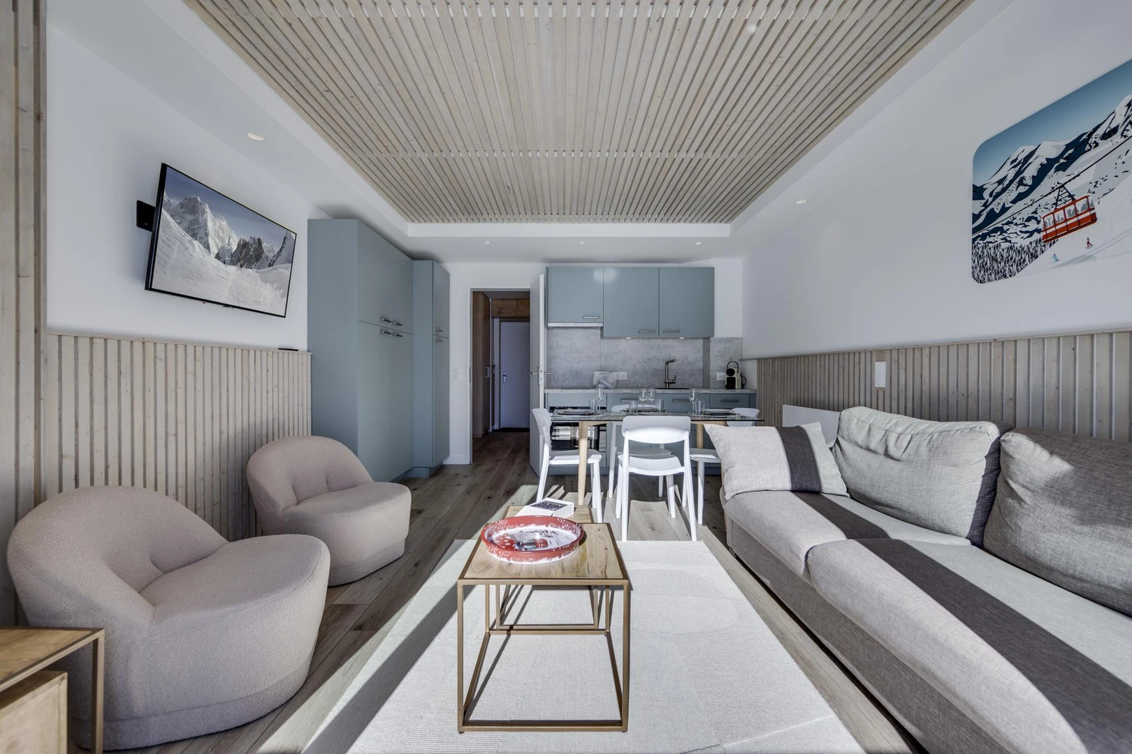 Perfect for a family of four (2 adults and 2 children), the apartment features a cozy cabin bedroom with a double bed and two convenient foldaway bunk beds in the hallway. The open-plan living space includes a comfortable lounge, dining area, and a fully equipped kitchen, all designed in a warm, contemporary style.