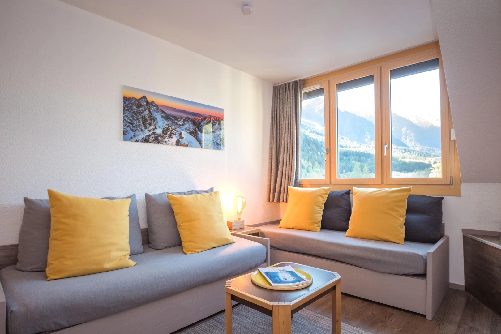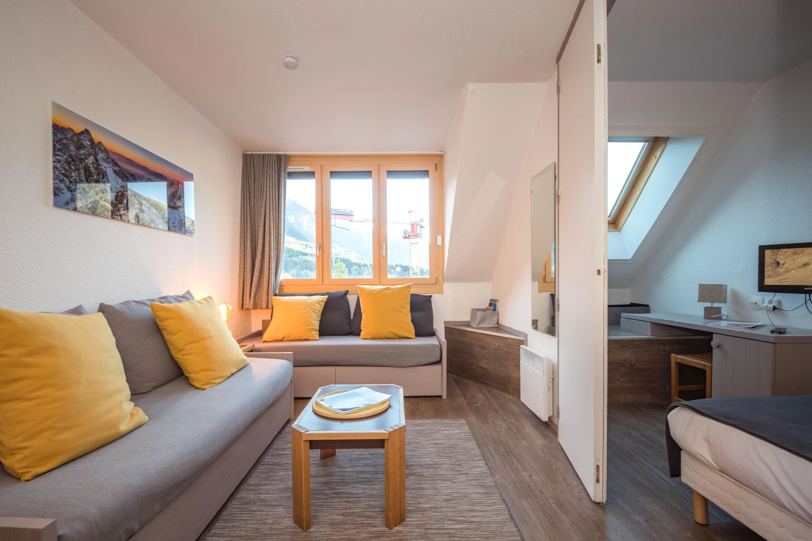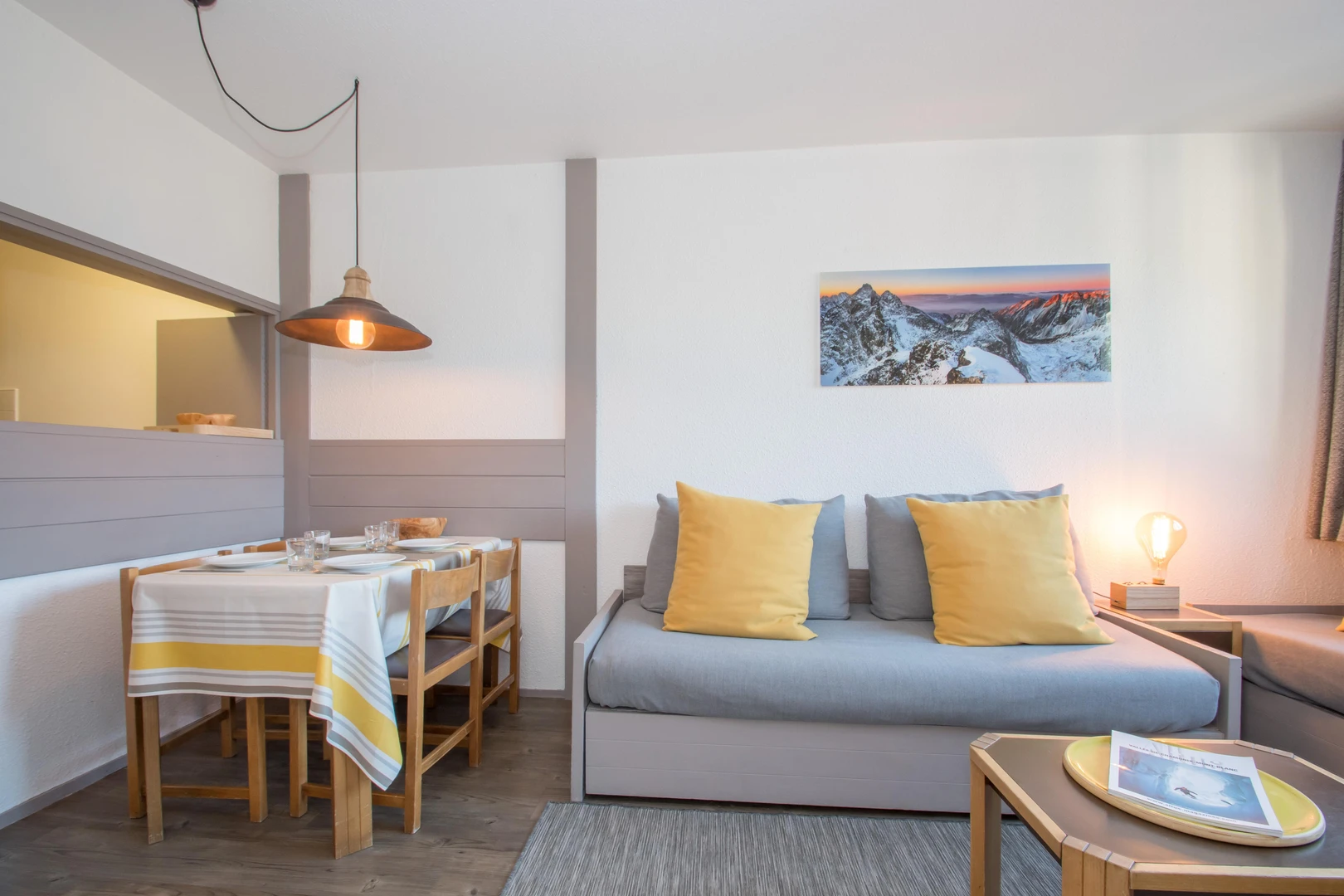 It can accommodate up to 4 guests thanks to a double bedroom with removable sliding doors opening onto the living room, and a sofa bed. The apartment features an open-plan kitchen, a living/dining area, a bathroom, and a separate toilet. Facing southwest, it offers a stunning view of the surrounding mountains.