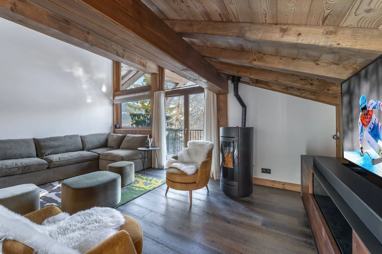 Blending modern design with traditional alpine chalet materials, the apartment offers a warm atmosphere, with breathtaking views that fill the space with natural light.