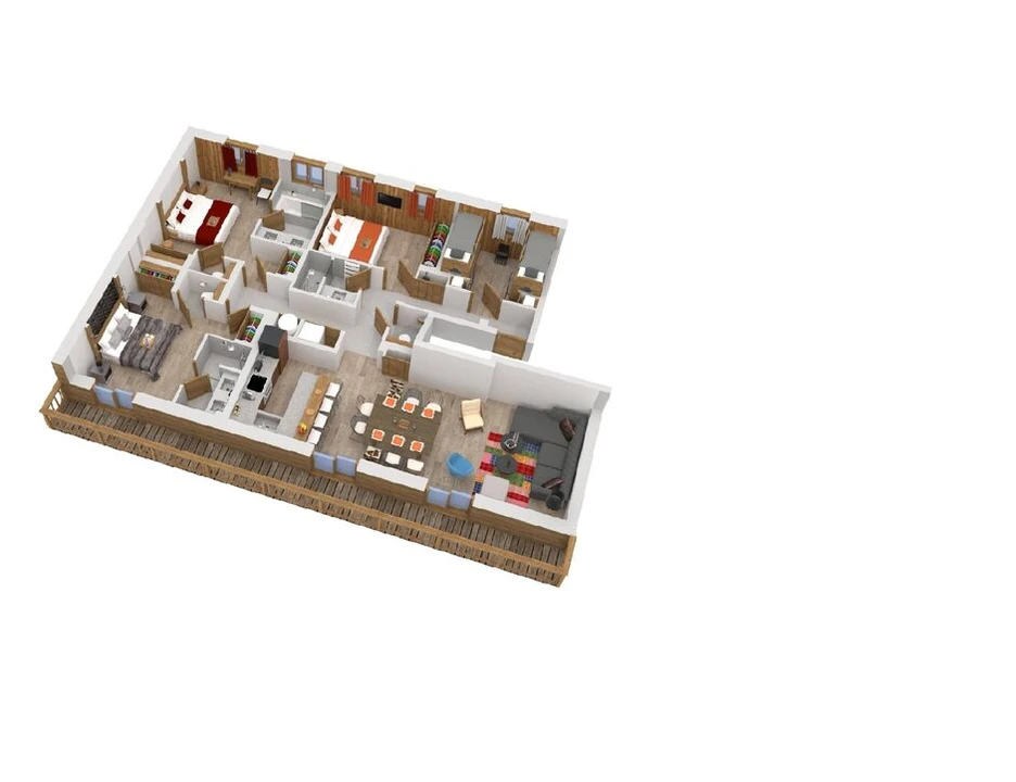 The apartment has 2 double bedrooms with en-suite bathrooms, a separable double room, and a children's bedroom with bunk beds. There’s also an additional independent bathroom.