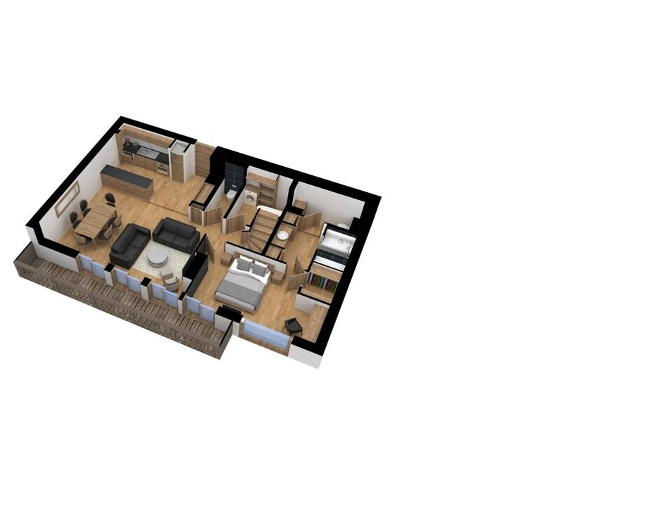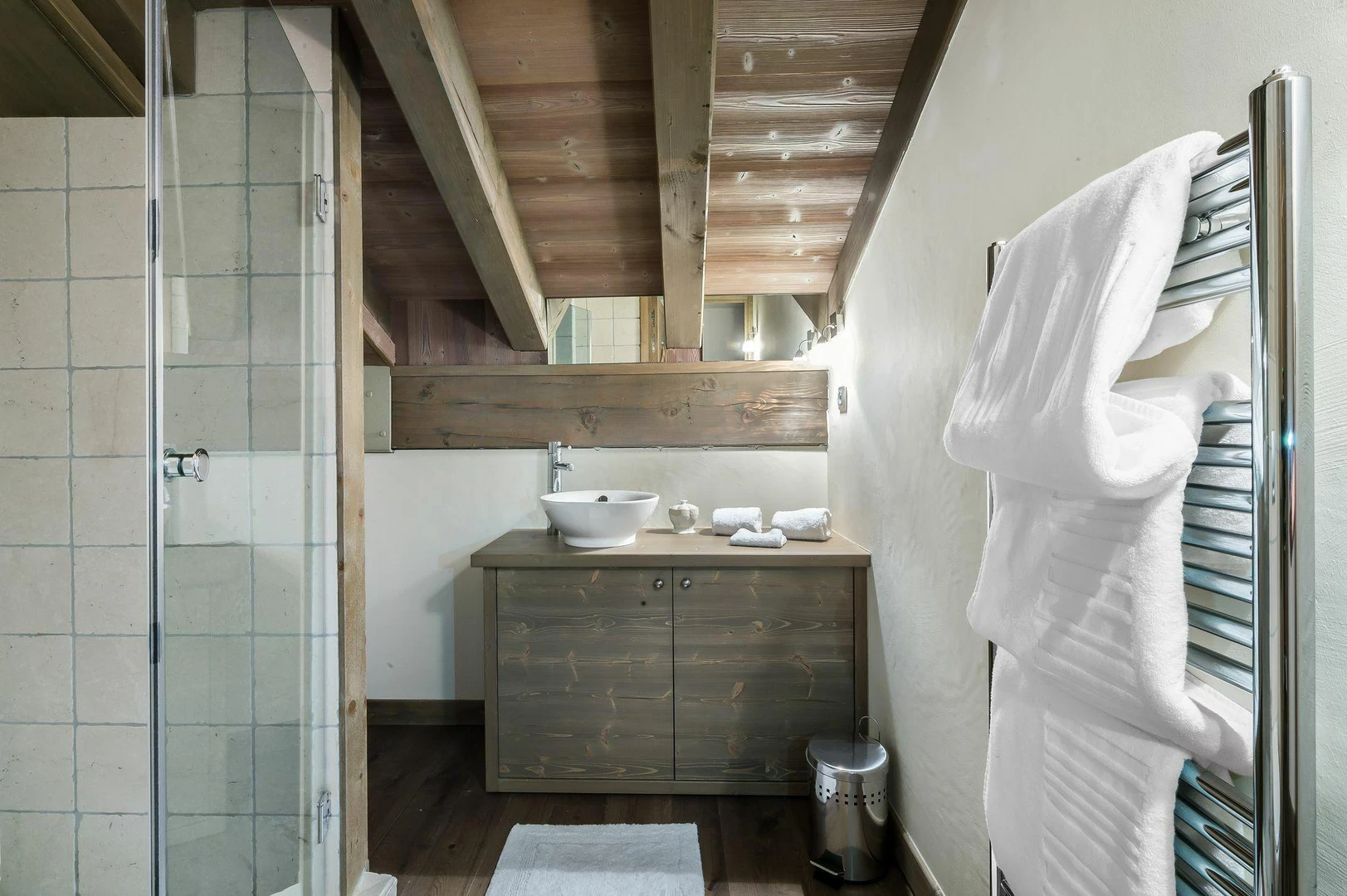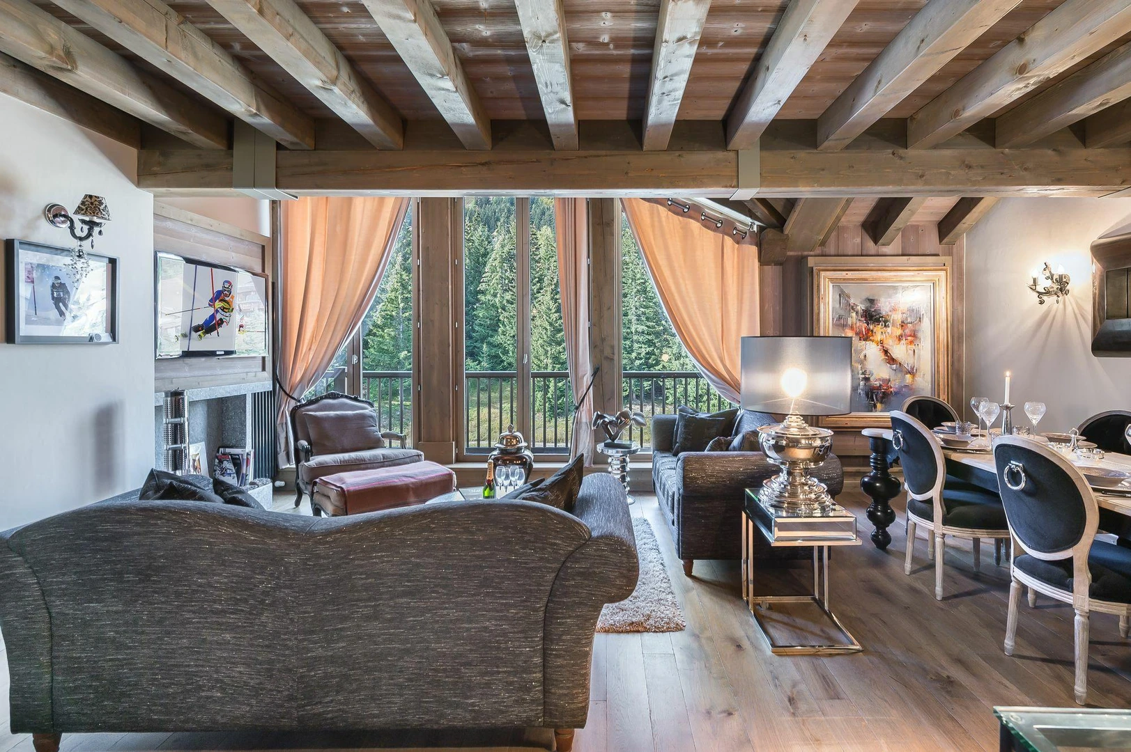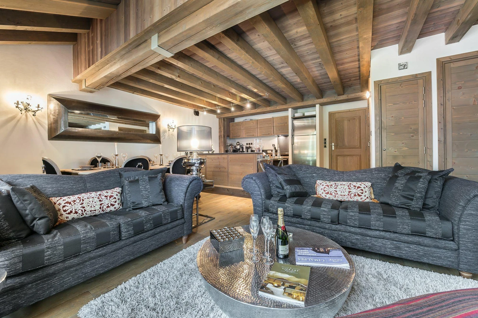 With warm tones, wood accents, and charcoal gray, this duplex strikes the perfect balance between contemporary style and traditional charm, making it a highly sought-after rental in Courchevel 1850.