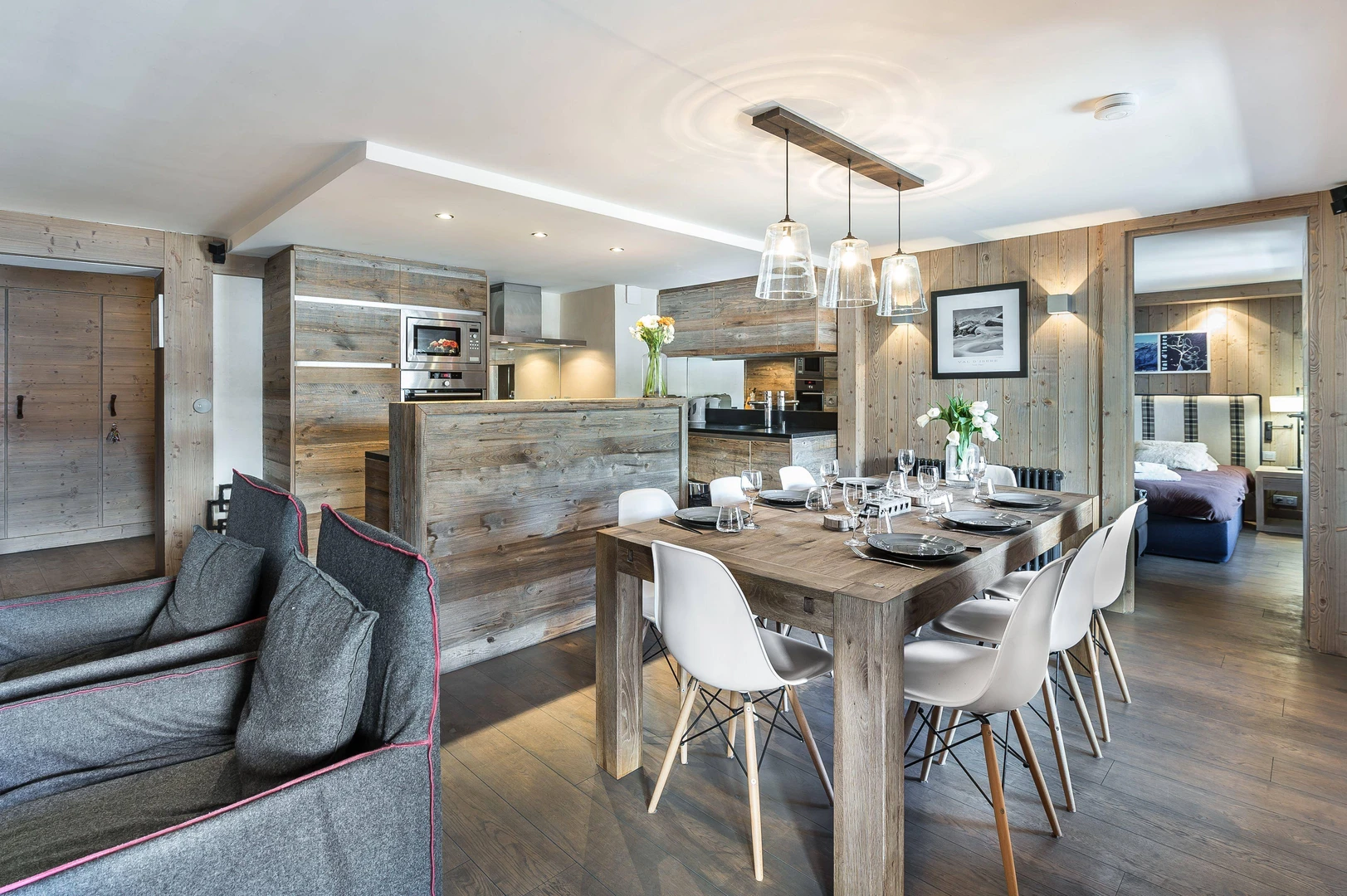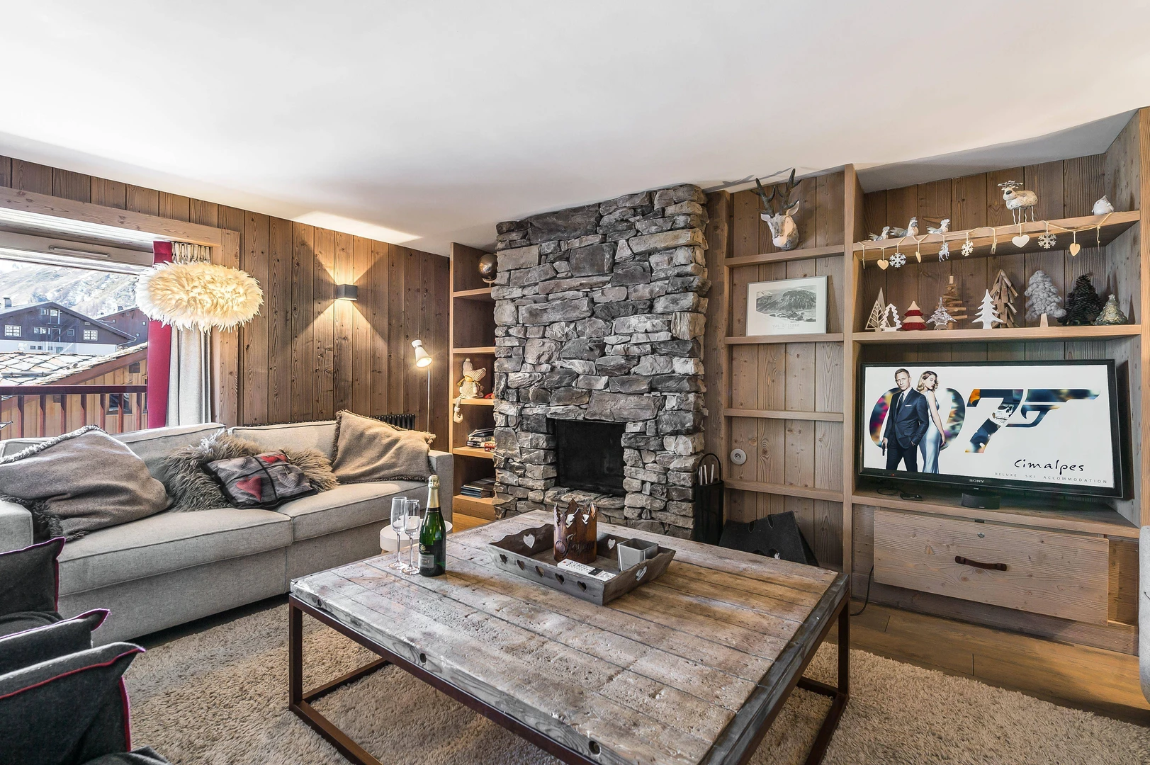 Blending modern and traditional design, the apartment features a spacious open-plan living area with a stone fireplace, ideal for cozy après-ski evenings.