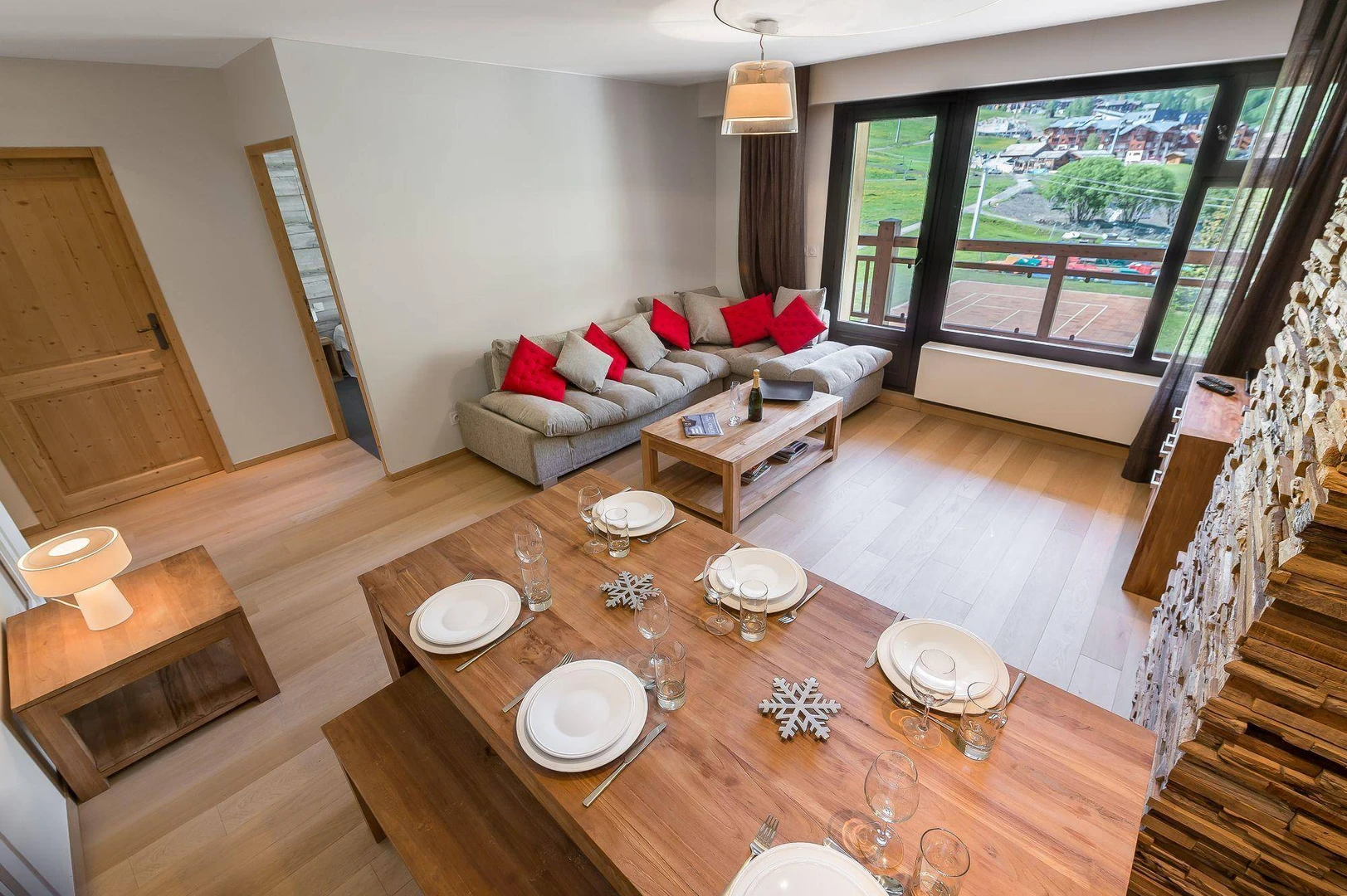 Blending modern comfort with traditional alpine charm, the apartment's chic and cozy decor is enhanced by sleek wooden furnishings that create a warm and inviting atmosphere. The generous living spaces and high-end amenities make it a perfect retreat for both relaxation and social gatherings.