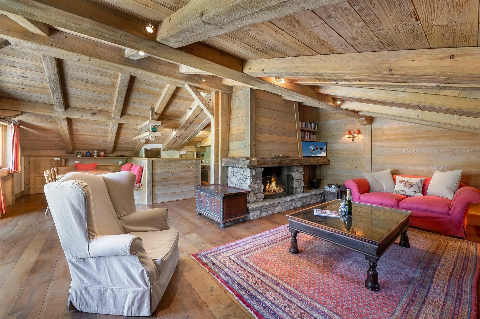 Designed for both relaxation and socializing, the apartment features four double bedrooms with en-suite bathrooms, as well as a spacious living area with a cozy fireplace, a dining space, and an open-plan kitchen. A large terrace extending from the living room invites guests to unwind while admiring the natural surroundings. The decor, a tasteful blend of wood and traditional alpine furnishings, evokes the timeless charm of classic mountain chalets.