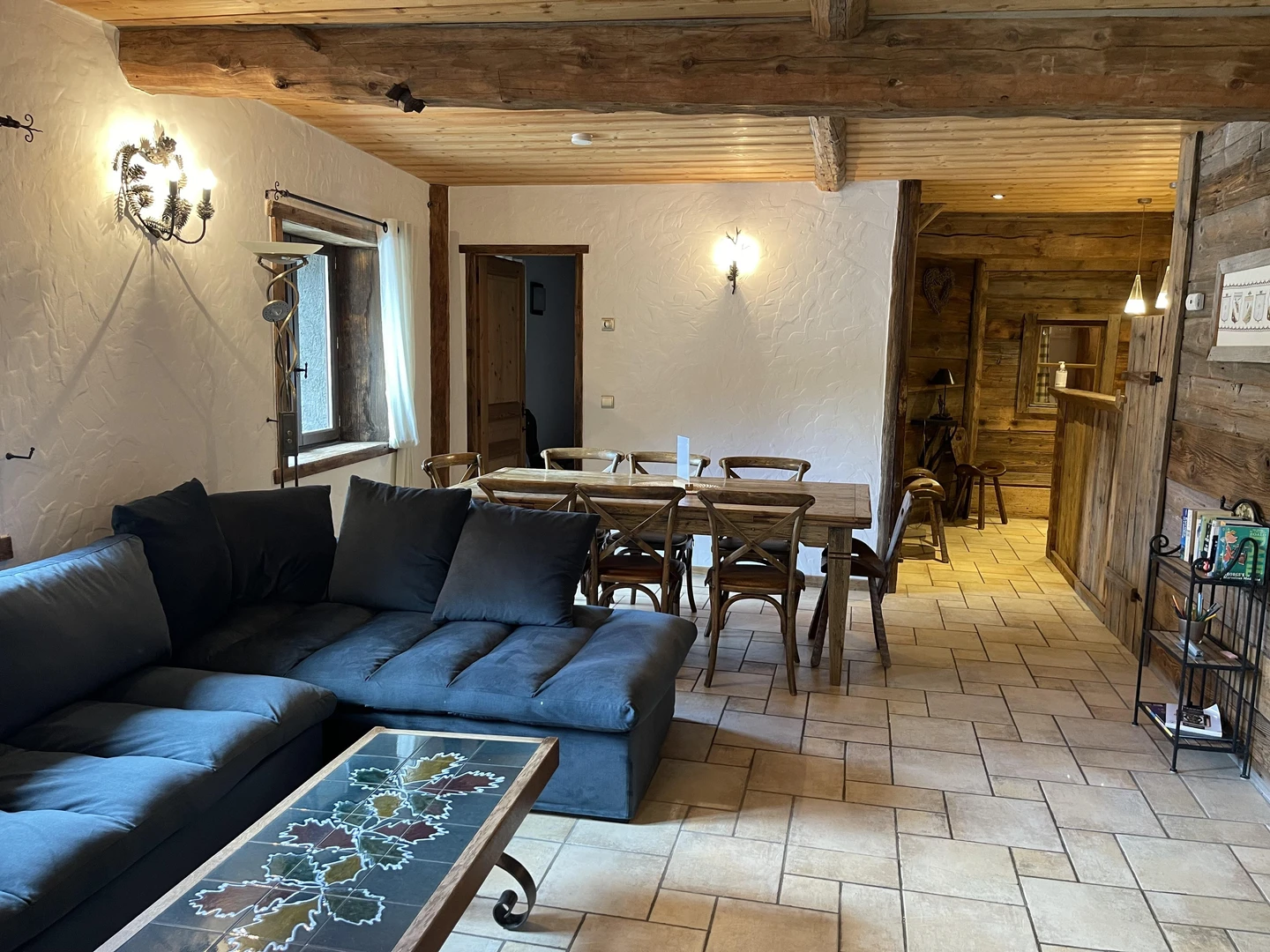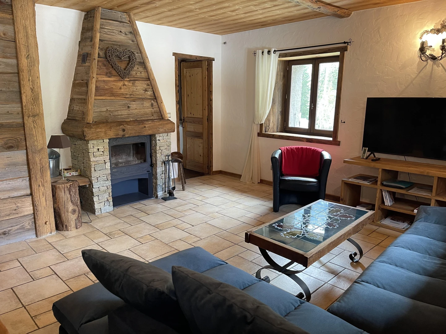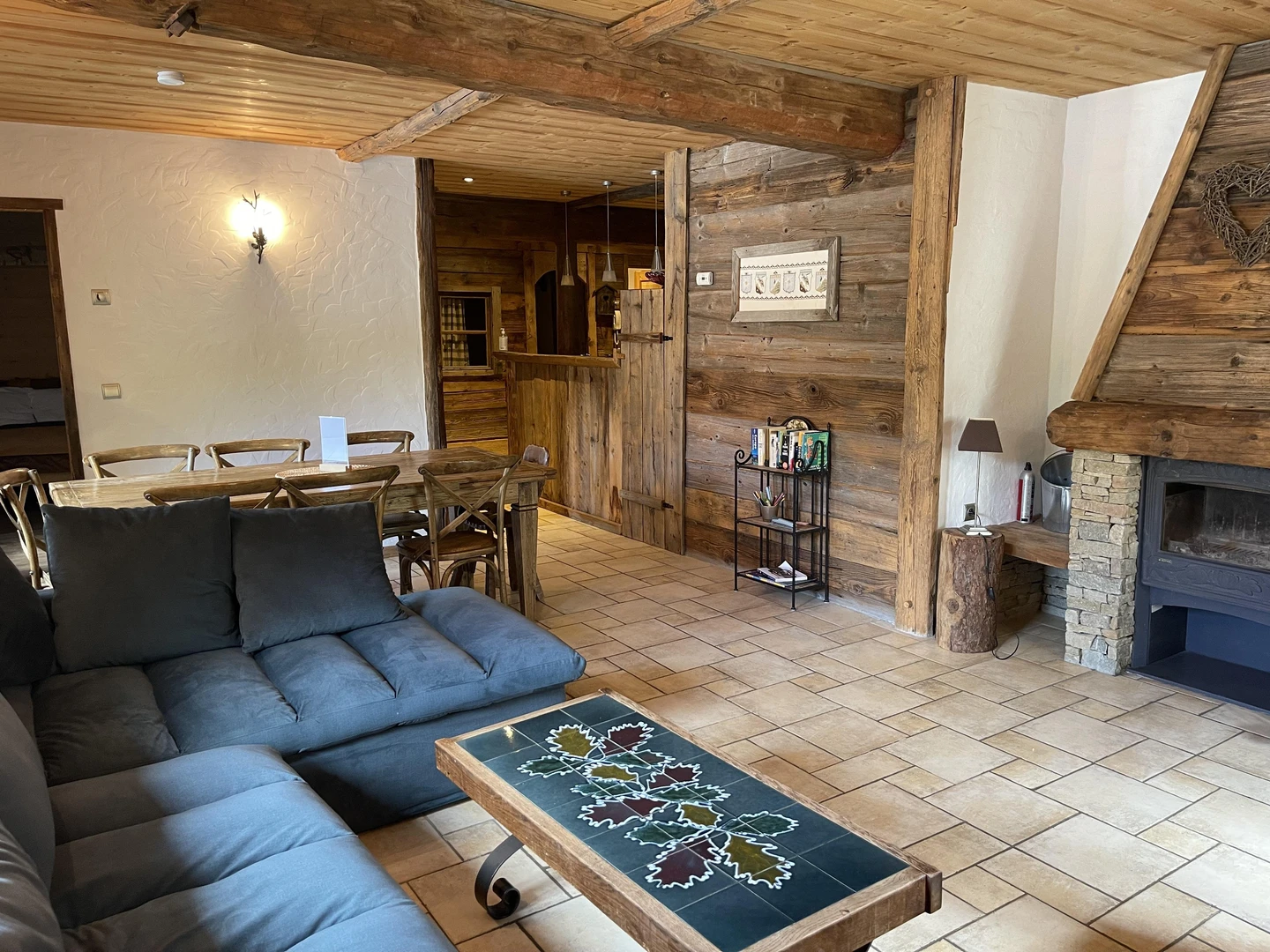 Inside, the atmosphere is warm and inviting. Raw materials like stone and reclaimed wood lend an authentic, rustic charm to the space. The open-plan kitchen is fully equipped and connects to a cozy living and dining room with a fireplace, perfect for sharing memorable moments with family or friends.
