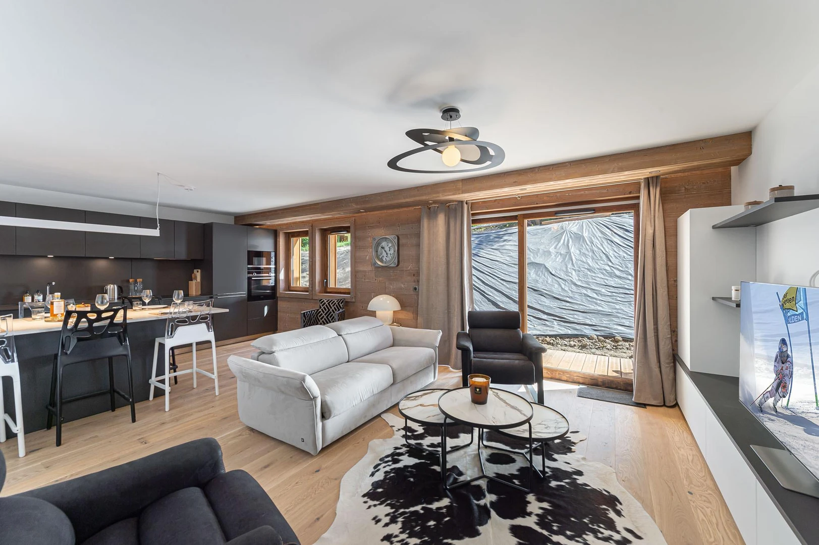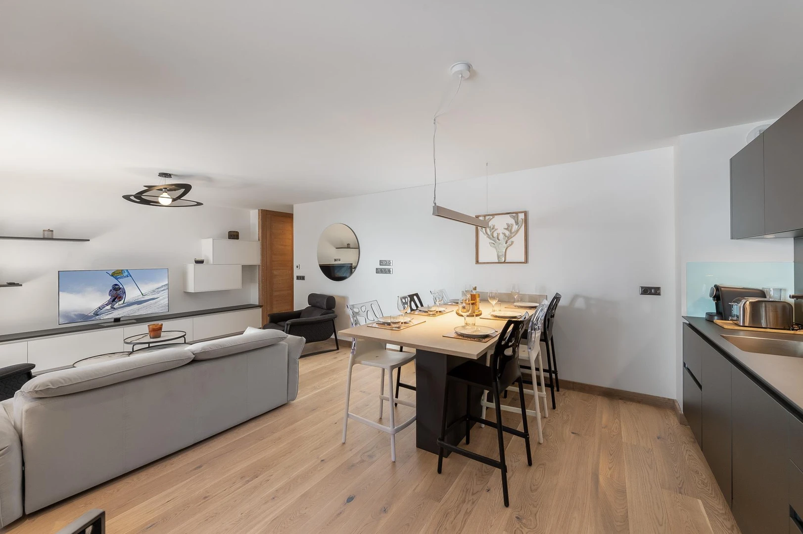 The open-plan living area features a cosy lounge, dining space, and a fully equipped kitchen. Contemporary design elements are softened by warm wood finishes and a calming colour scheme, creating an inviting alpine ambiance.