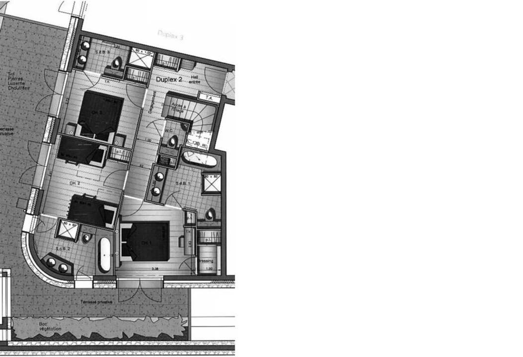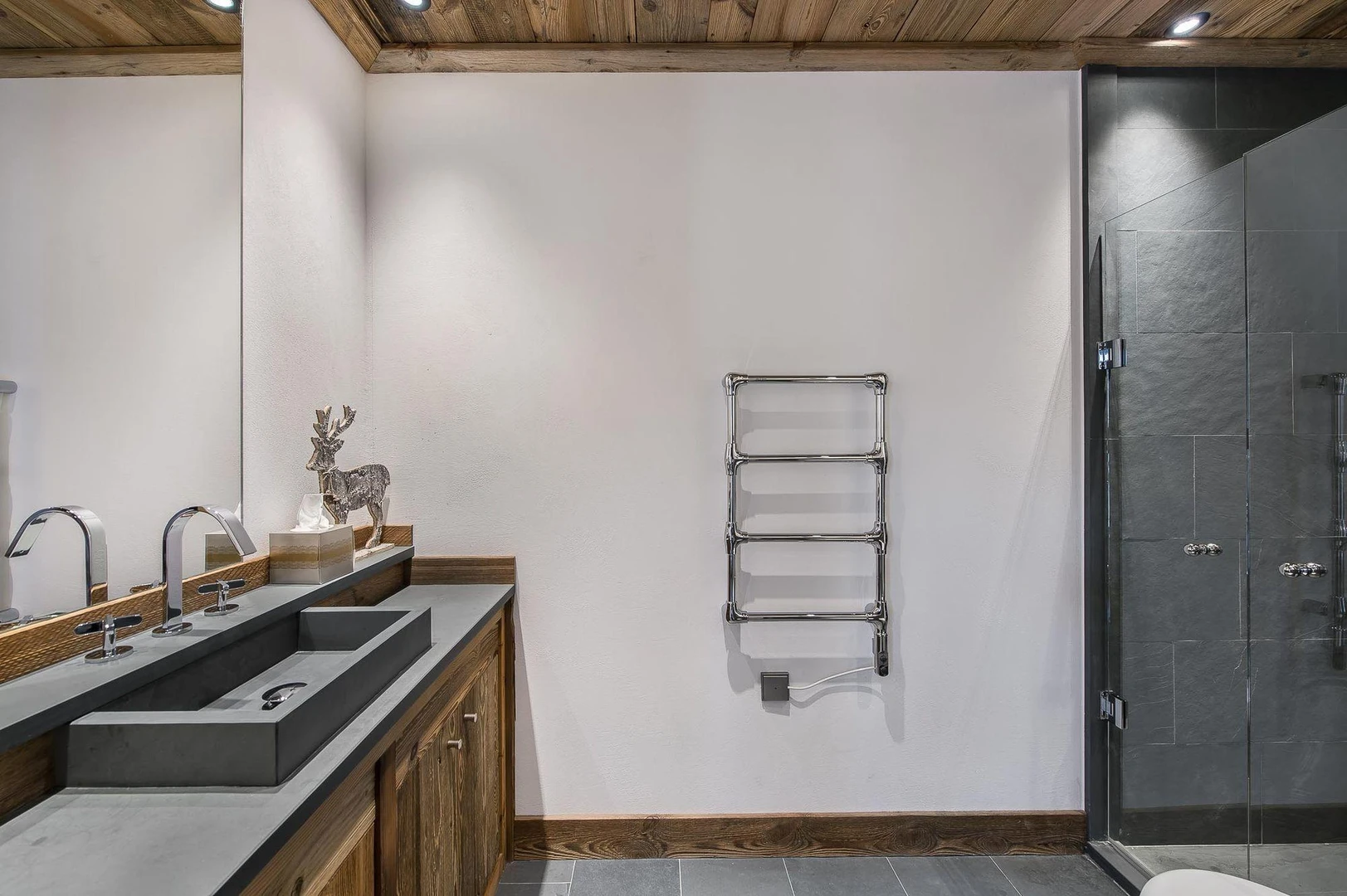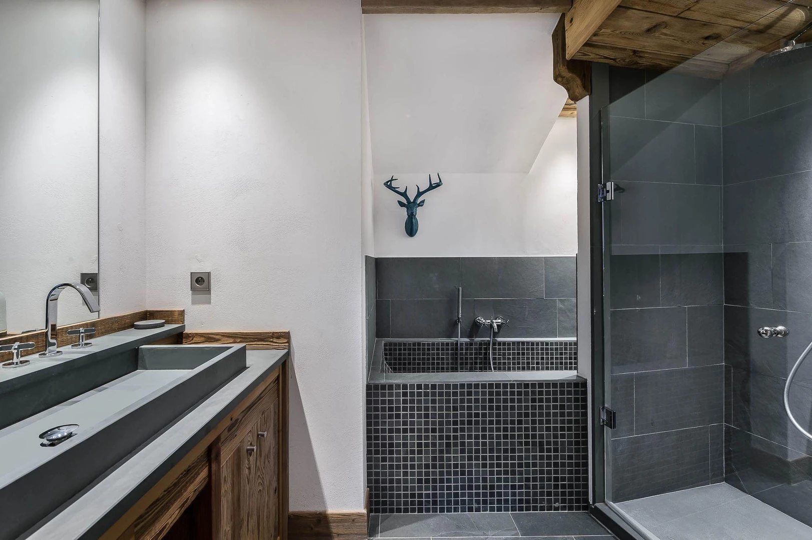 Spanning 127 sqm, the ground-floor duplex accommodates up to 10 guests in its three en-suite double bedrooms and one en-suite children’s bedroom. The open-plan living area, bathed in natural light through a distinctive tinted bow window, seamlessly combines a stylish lounge, dining area, and fully equipped kitchen. A striking cut-stone fireplace enhances the cozy yet contemporary ambiance, complemented by mountain-inspired materials like aged wood, raw wool, and soft fur.