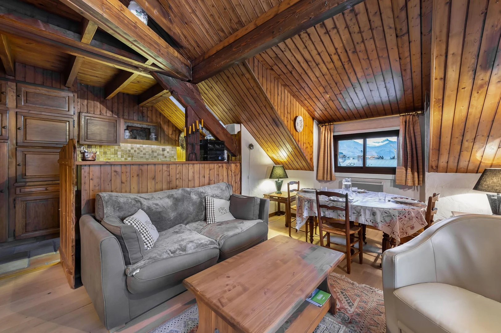 This 50sqm apartment is ideally located in the heart of Megève, on the 4th floor of a building with an elevator, offering easy access to all nearby amenities. The entrance opens directly into the living room, where the fully-equipped kitchen flows into a cozy space with a fireplace, creating a warm and inviting atmosphere. The apartment can accommodate 2 adults and 3 children, with a double bedroom en suite and a bedroom with 3 single beds. A staircase leads from the living room to a charming reading area and an independent shower room, adding to the apartment's appeal.
