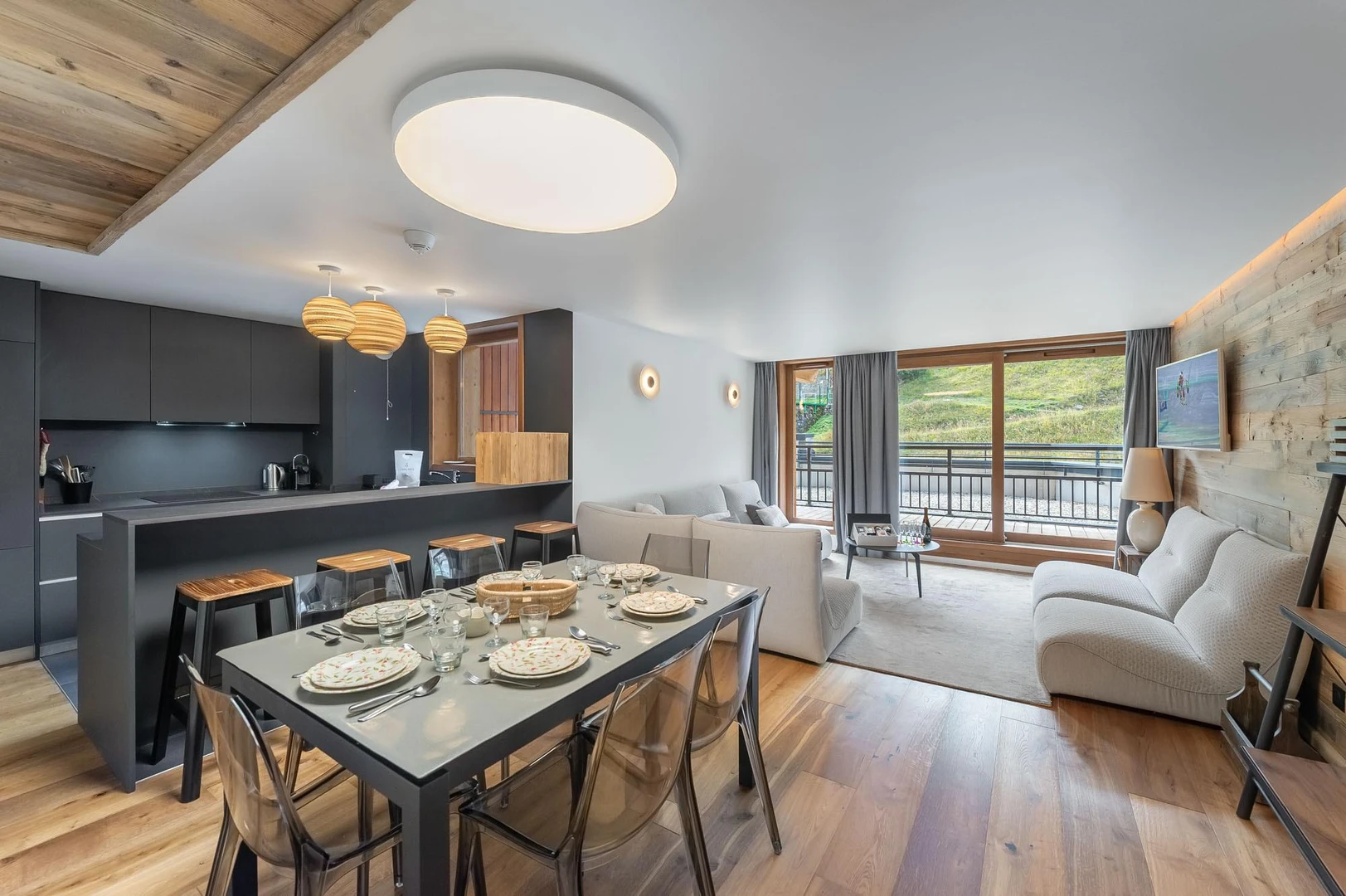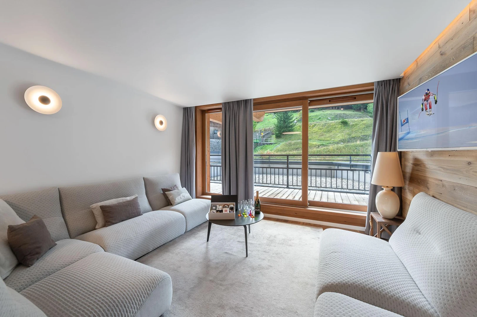 Designed with a blend of modern comfort and mountain charm, the apartment radiates warmth and relaxation. Natural wood, soothing tones, and plush furnishings create a serene retreat after active days outdoors. The spacious living area combines a sleek fitted kitchen with a bar, an inviting dining space, and a cozy lounge where large bay windows open onto the surrounding landscape, filling the interiors with light and stunning views.