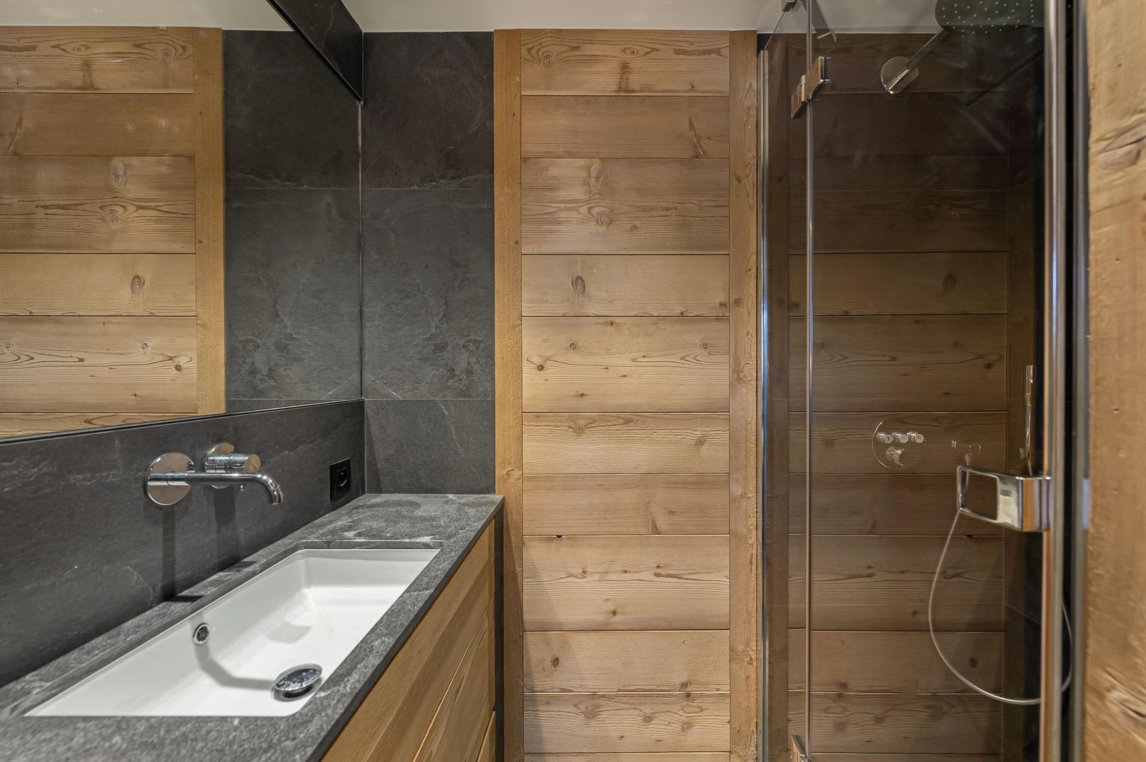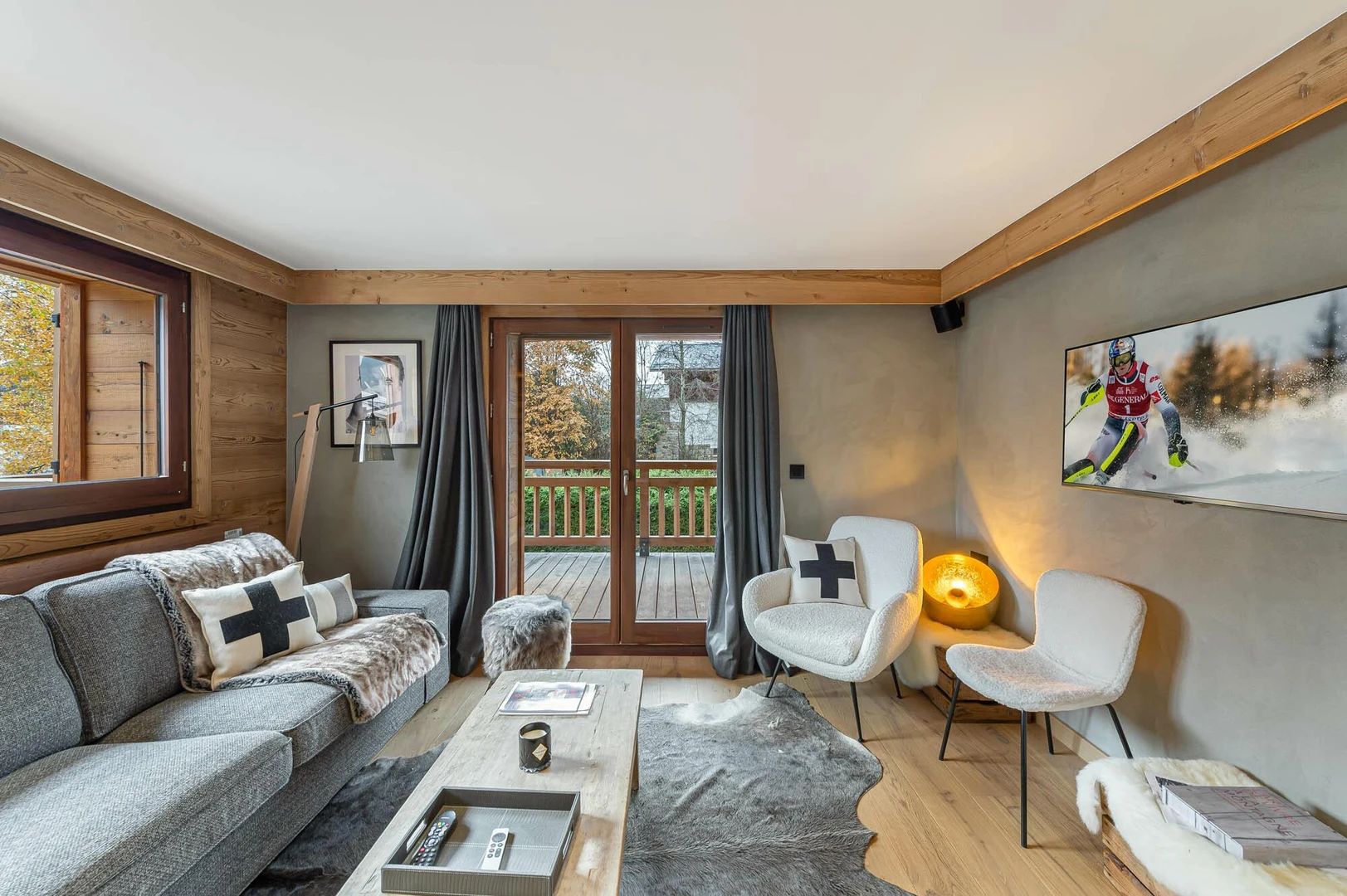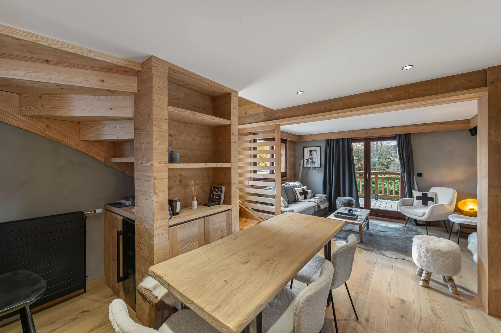 The apartment’s built-in wood furnishings paired with a palette of soft gray tones create an elegant yet functional living space with a calming ambiance. Whether you're planning a short getaway or an extended seasonal stay, Les Seigneurs offers the perfect alpine retreat.