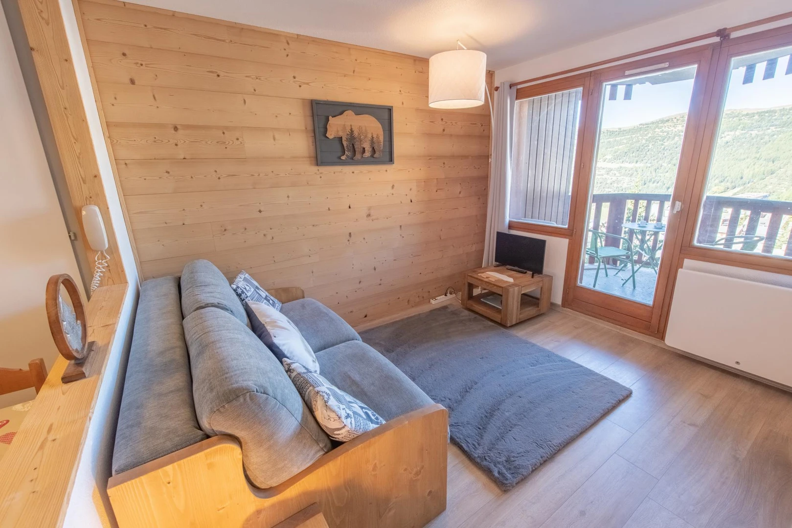 The apartment comfortably accommodates 2 adults and 2 children, with a cabin featuring bunk beds and a sofa bed for added flexibility. The living area includes a kitchenette, dining space, and lounge, all opening onto a west-facing balcony with stunning views of the resort’s surrounding peaks.