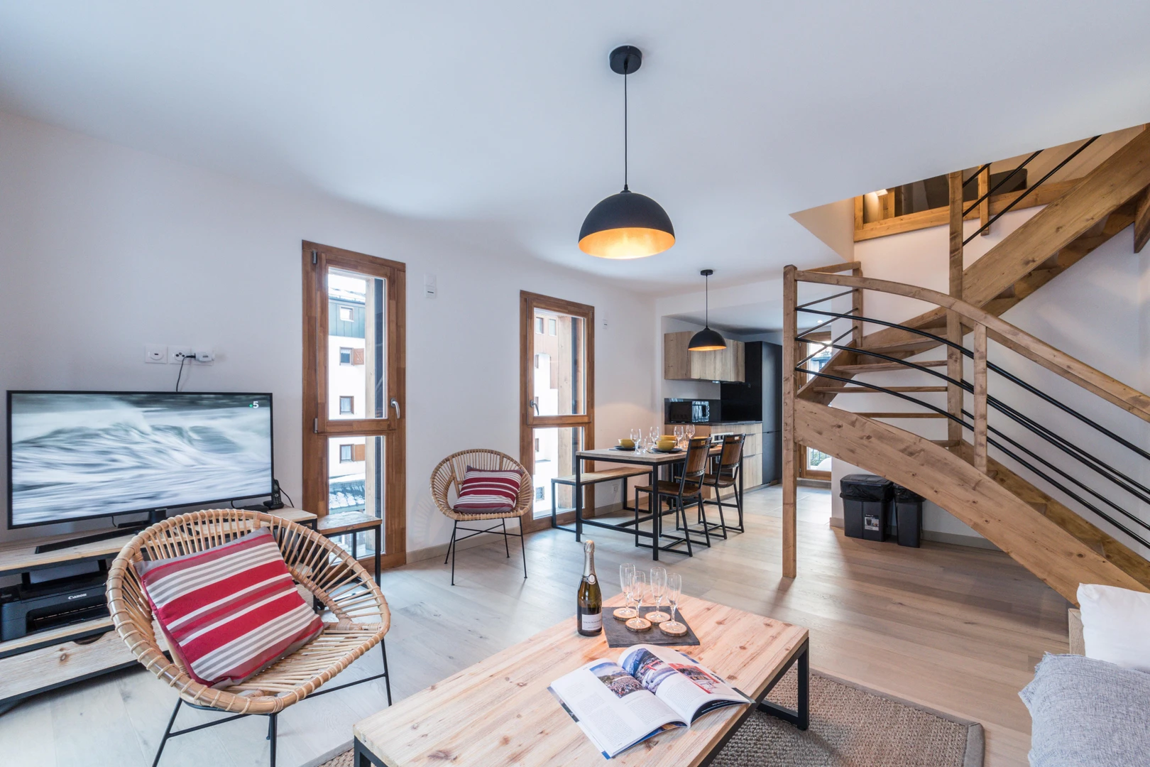 This superb duplex apartment is located on the 2nd floor (no elevator) of a new and quiet residence in the center of Chamonix, in the Lyret area. Just 100 meters from a stop for the free shuttle bus, it offers easy access to the slopes located around 1 km away.