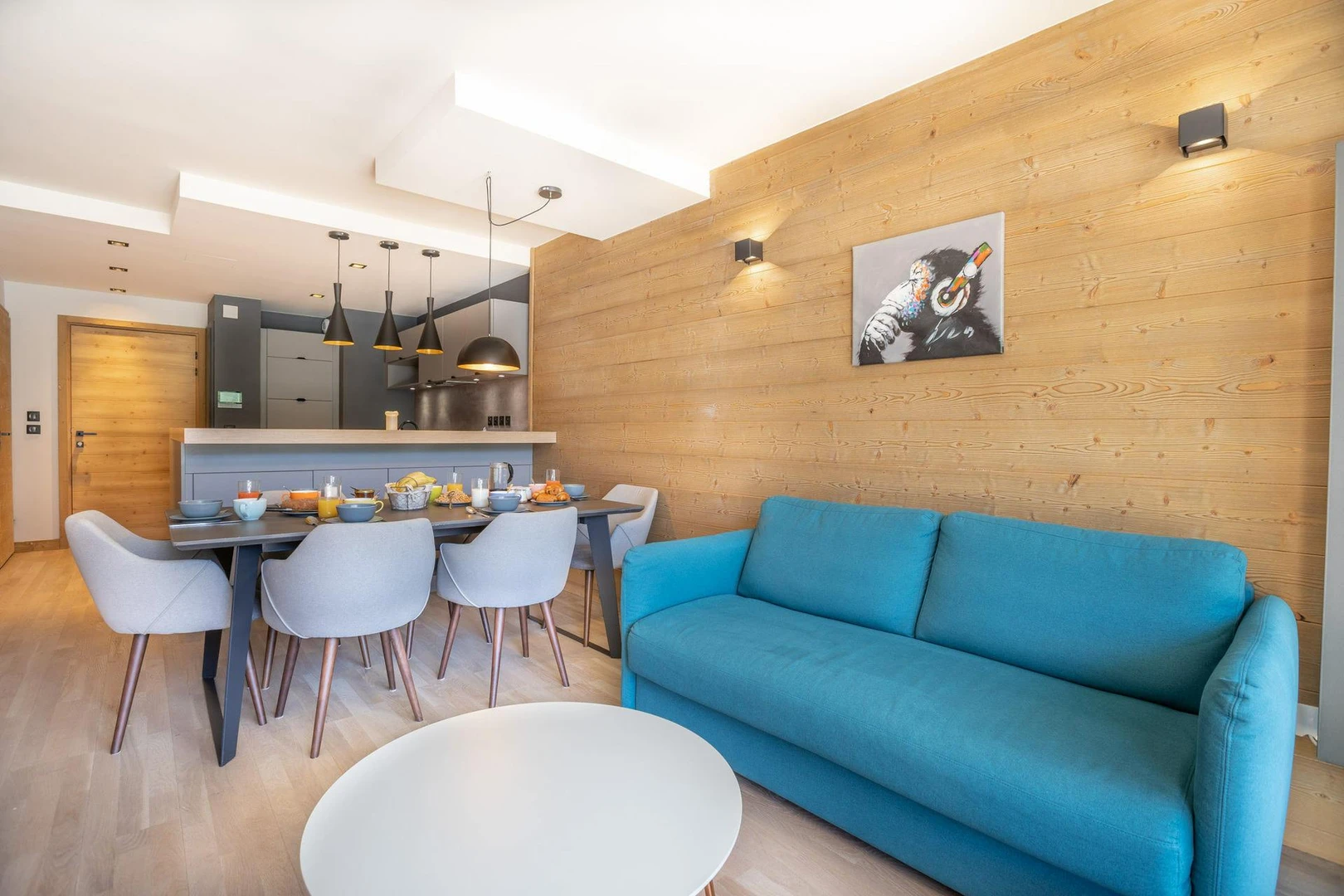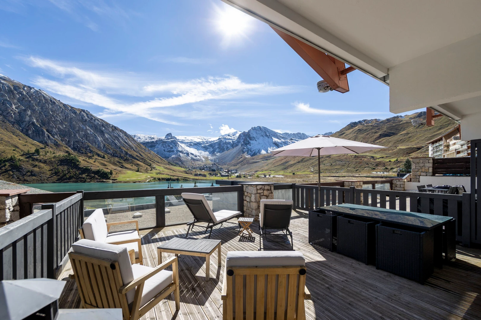 The apartment features a double bedroom with an additional single bed, a cabin room with bunk beds, and a welcoming living area with a modern kitchen that opens into a dining and lounge space. The highlight is its expansive 35 sqm south-facing terrace, offering uninterrupted views of Lac de Tignes and the surrounding mountains.