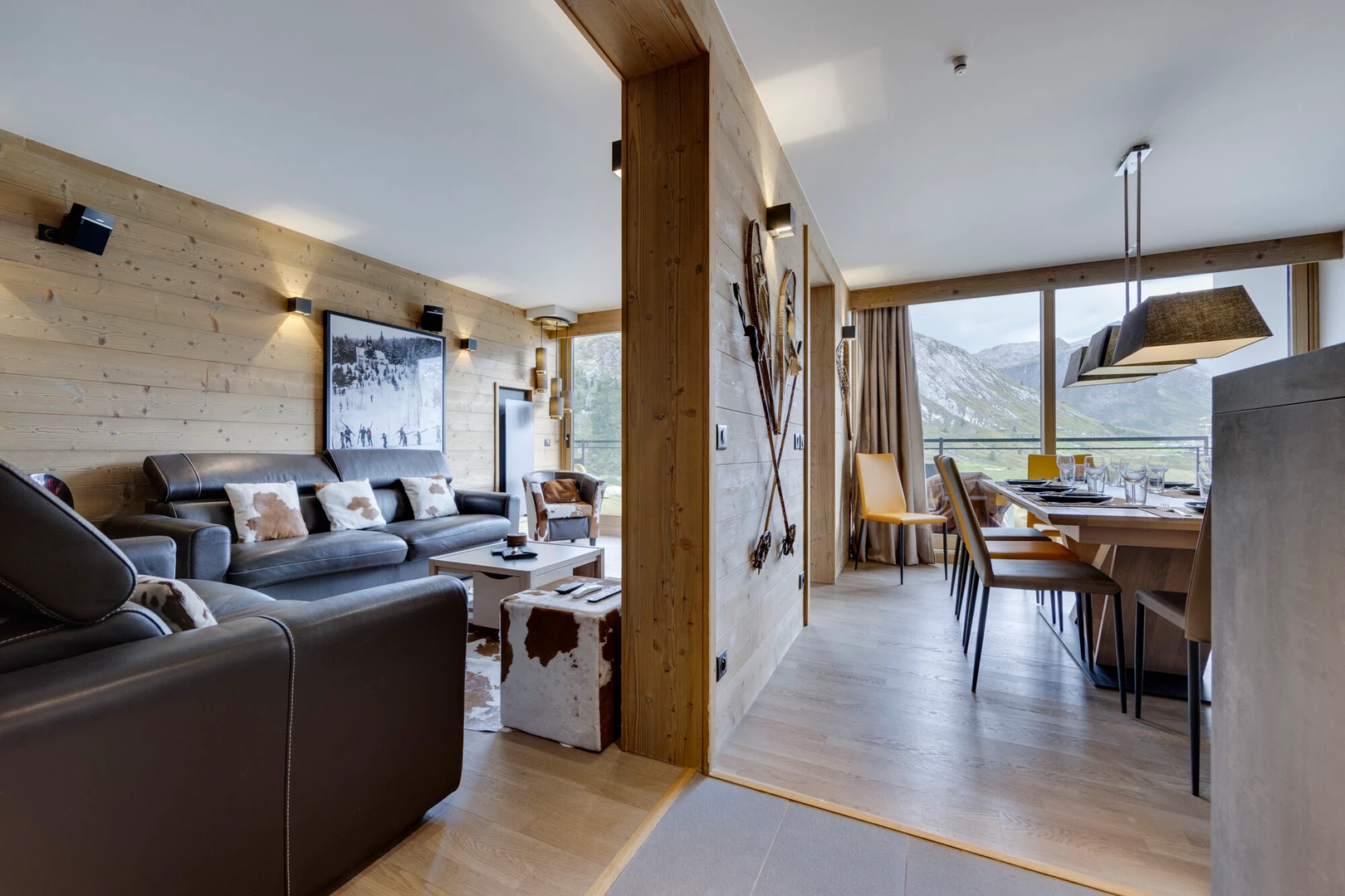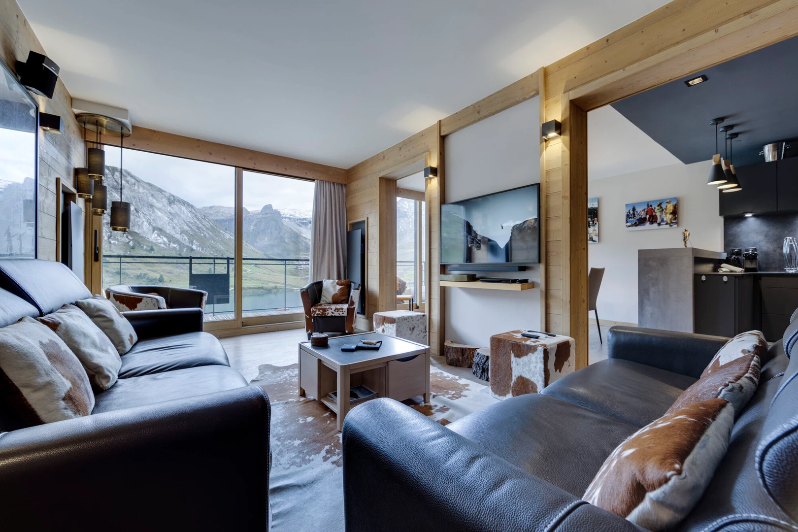 Designed for comfort and conviviality, the apartment features a fully equipped open-plan kitchen, a dining area, and a cozy lounge with two sofa beds, armchairs, and Apple TV. The large south-facing balcony invites you to unwind with panoramic views of Lac de Tignes and the surrounding peaks of Tovière and Grande Motte.