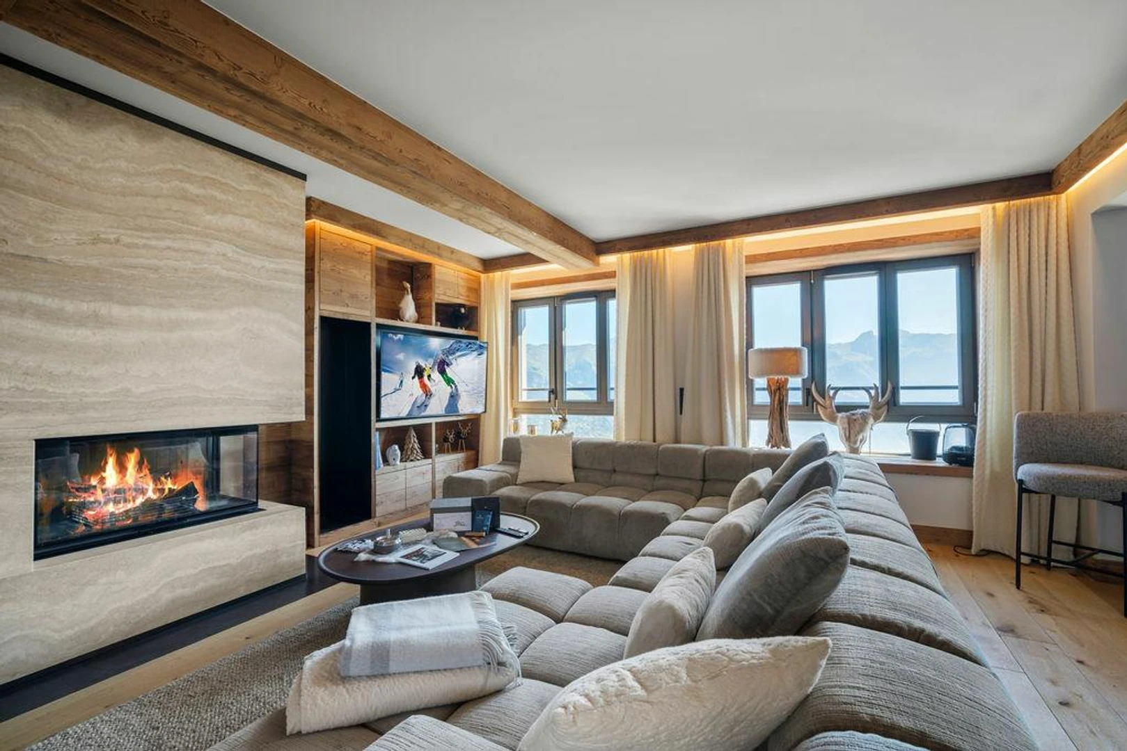 The residence is set in a peaceful environment, offering stunning panoramic views of the surrounding snow-capped peaks. Elegantly finished with high-quality wood, fabrics, and carpets, the apartment exudes warmth and sophistication, creating a cozy alpine retreat filled with natural light.