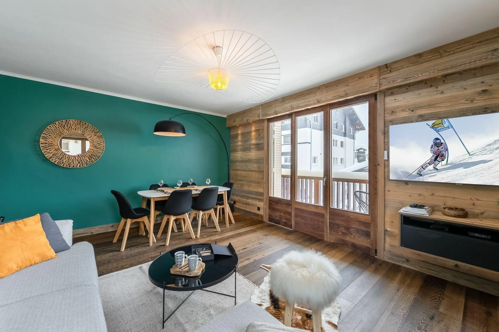Tastefully decorated with a blend of modern comfort and alpine charm, the apartment features a bright living room that opens onto a balcony, perfect for enjoying fresh mountain air. The space also includes a dining area and a fully equipped kitchen, ideal for cozy evenings after a day on the slopes.