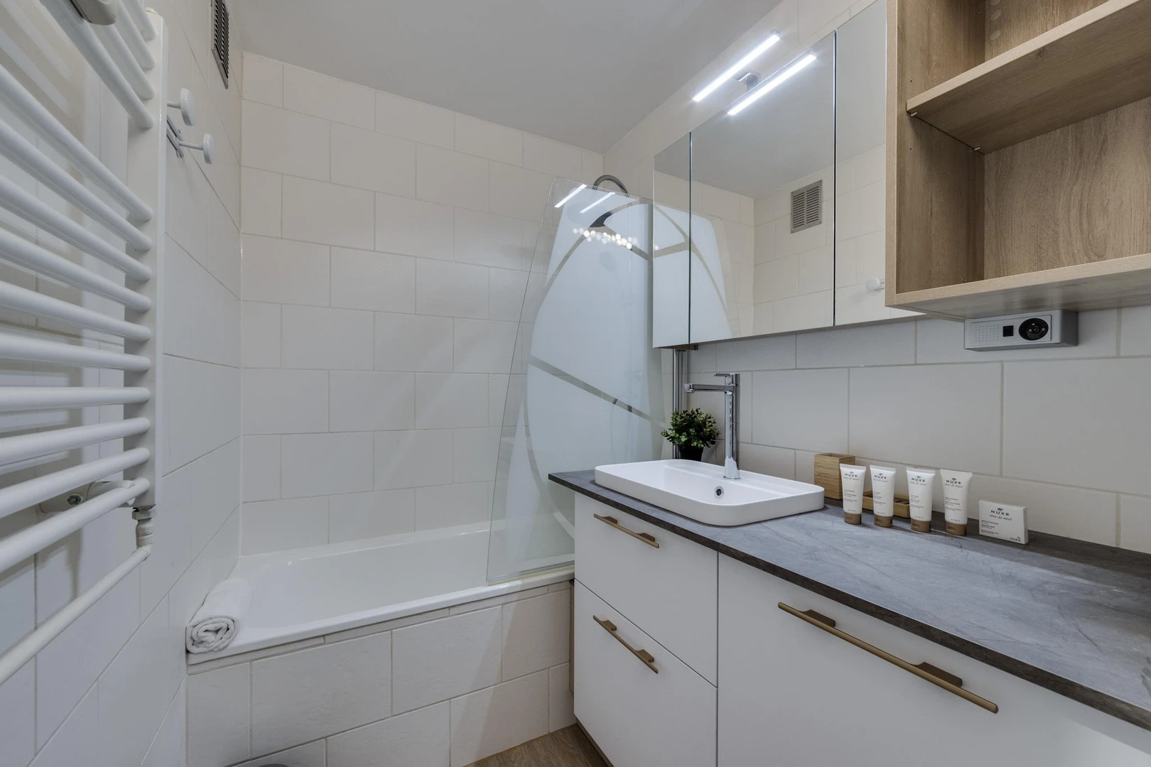 The Schuss 505 apartment, located on the 5th floor of the residence, has been tastefully renovated and boasts a stunning view of the Val Claret area and surrounding peaks. Benefiting from a sunny south-west exposure, it offers plenty of natural light throughout the day.