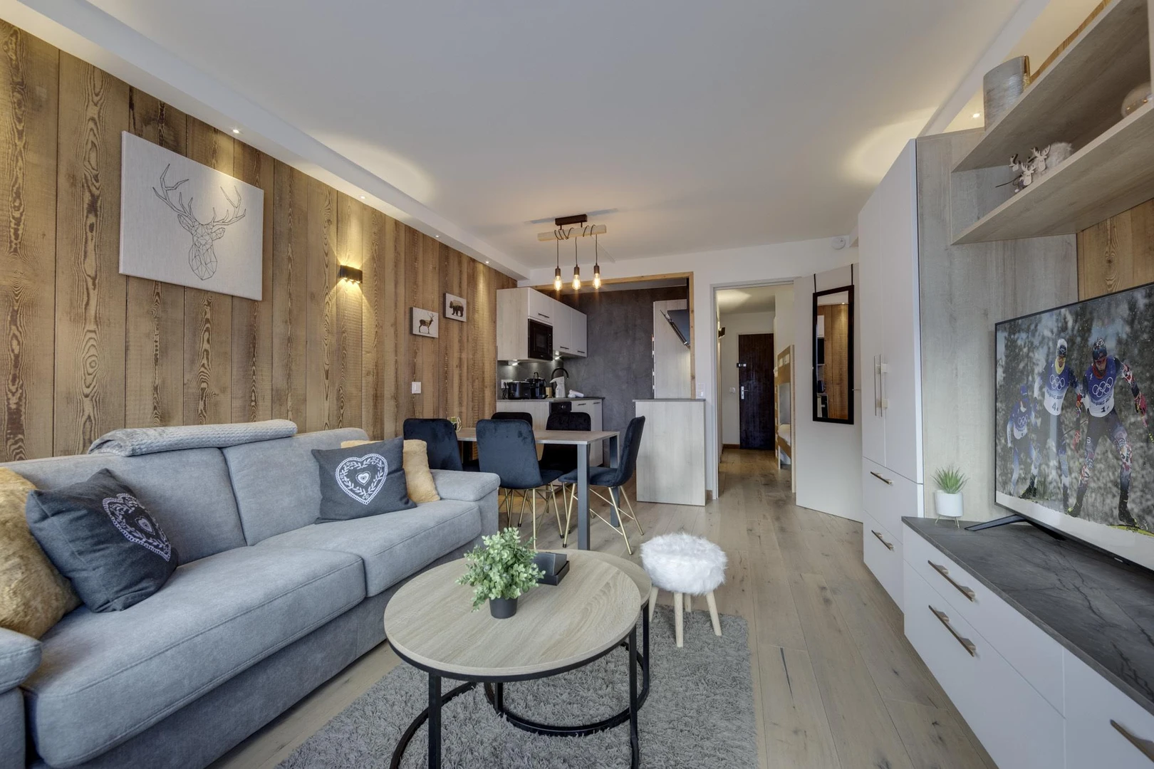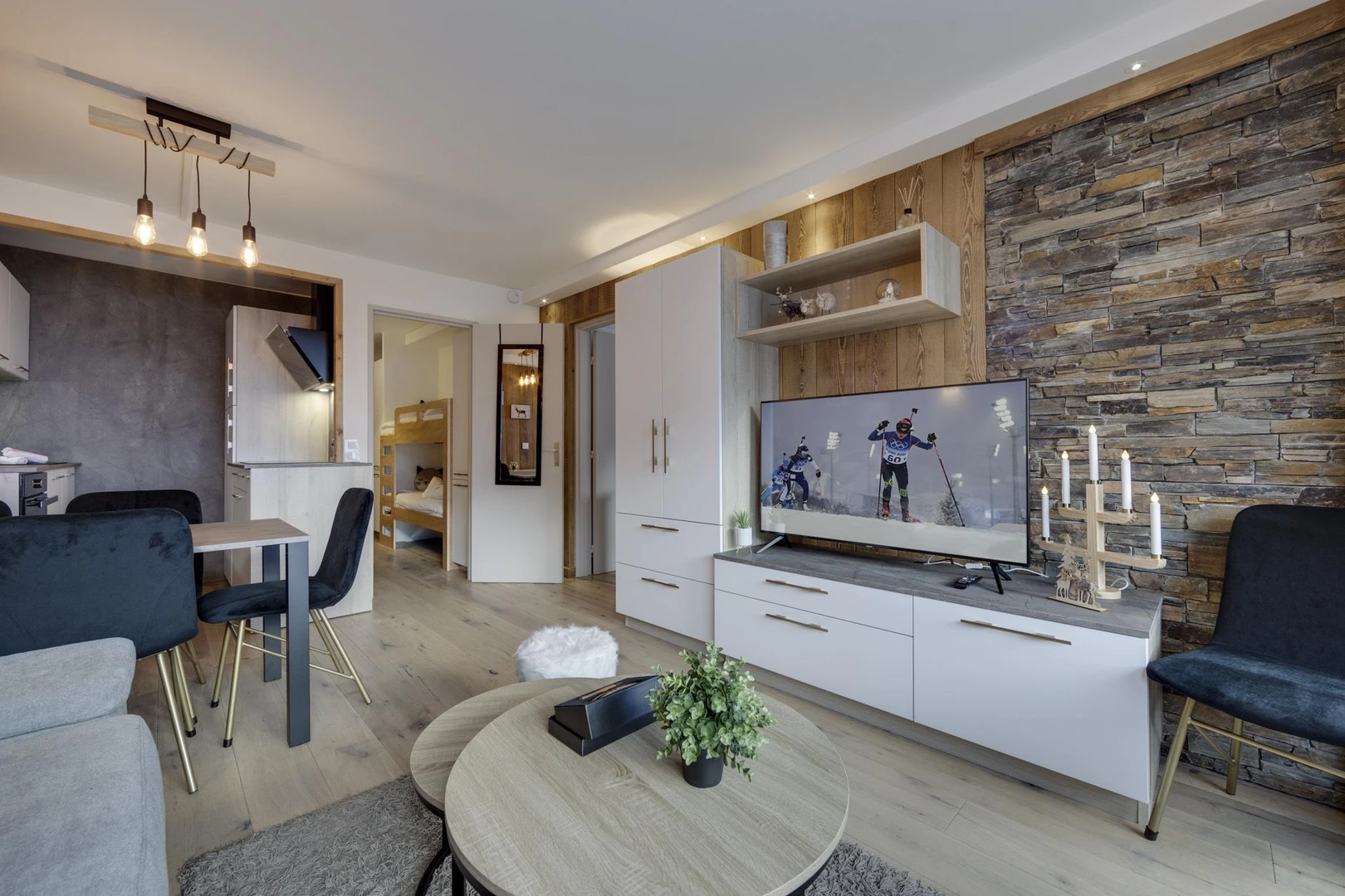 With a cosy and welcoming atmosphere, the apartment features a double bedroom, a mountain corner with a bunk bed ideal for children, and a bathroom. The living area includes a comfortable lounge, a dining space, and a fully equipped kitchen, perfect for relaxing after a day on the slopes. A warm, alpine-inspired décor ensures you’ll feel right at home.