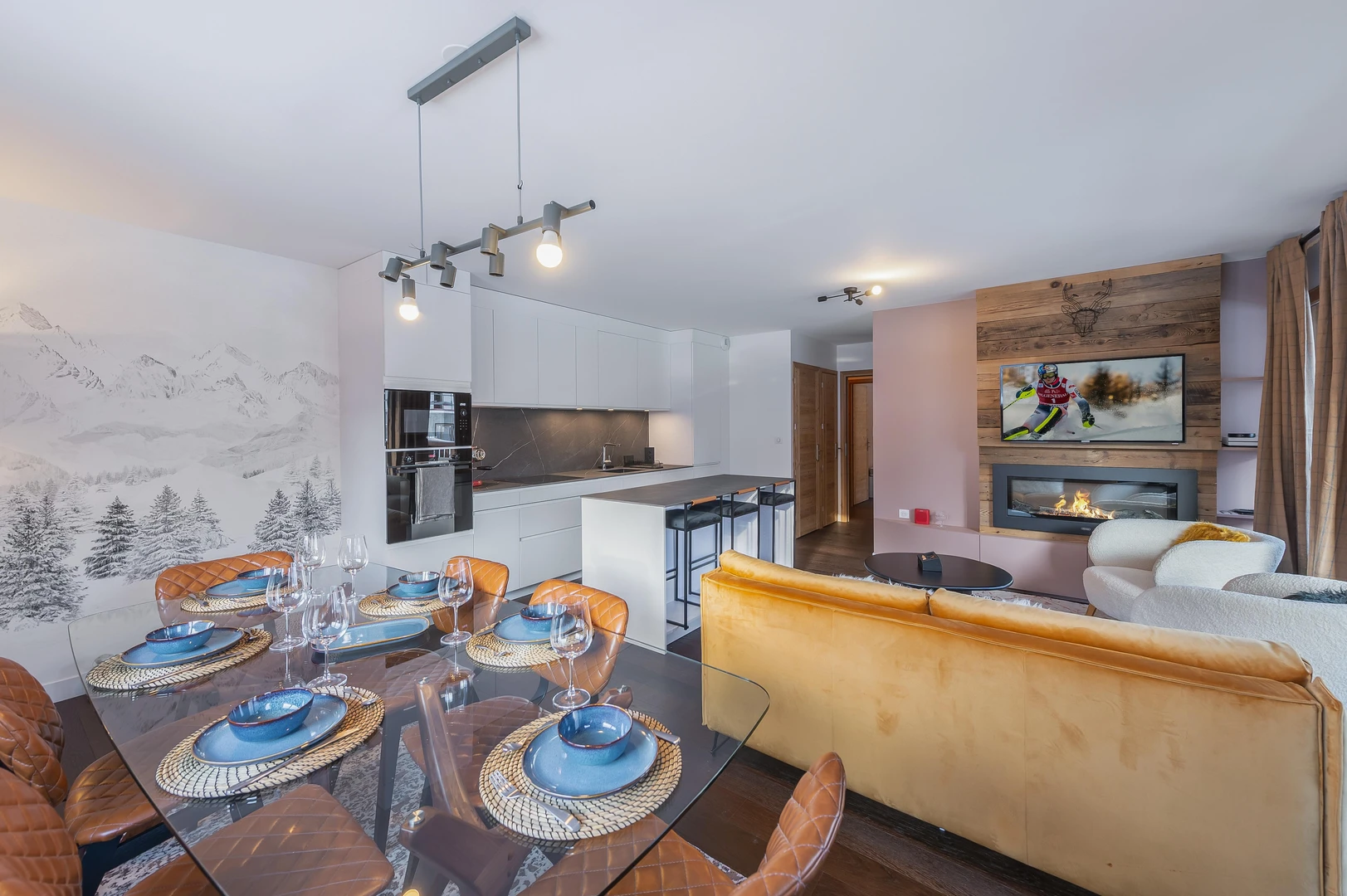 Spanning 74 sqm, the apartment comfortably hosts up to 5 guests. The living area features a fully equipped kitchen with a central island, a cozy lounge with a fireplace, and a dining space that opens onto a generous balcony perfect for soaking up the views on sunny days. A piano adds a special touch for music lovers, setting the tone for cozy evenings indoors.