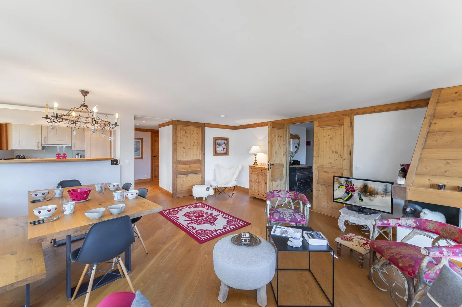 Soleil Levant 19A is a spacious 106 sq.m apartment with direct access to the 3 Valleys ski area and nearby amenities, including Le Forum shopping center, a supermarket, and an ice rink.
