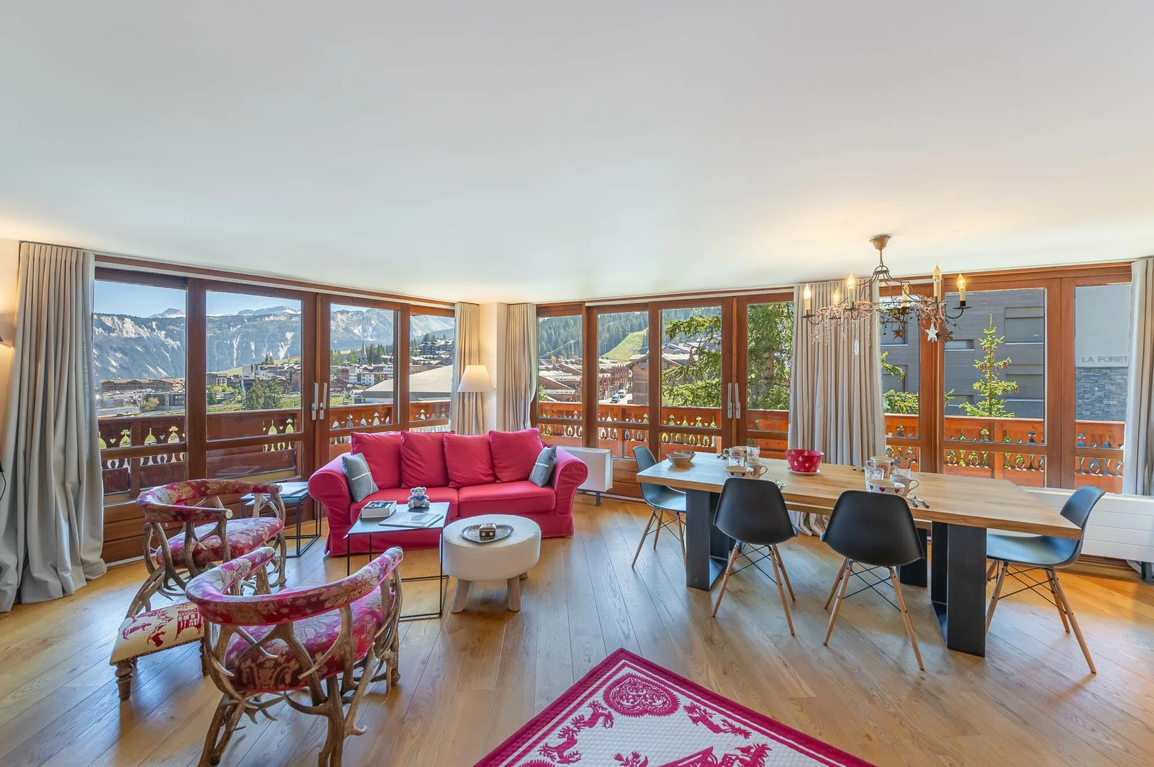 The bright living area features large bay windows, a modern open kitchen, and a dining space with Savoyard-inspired decor.