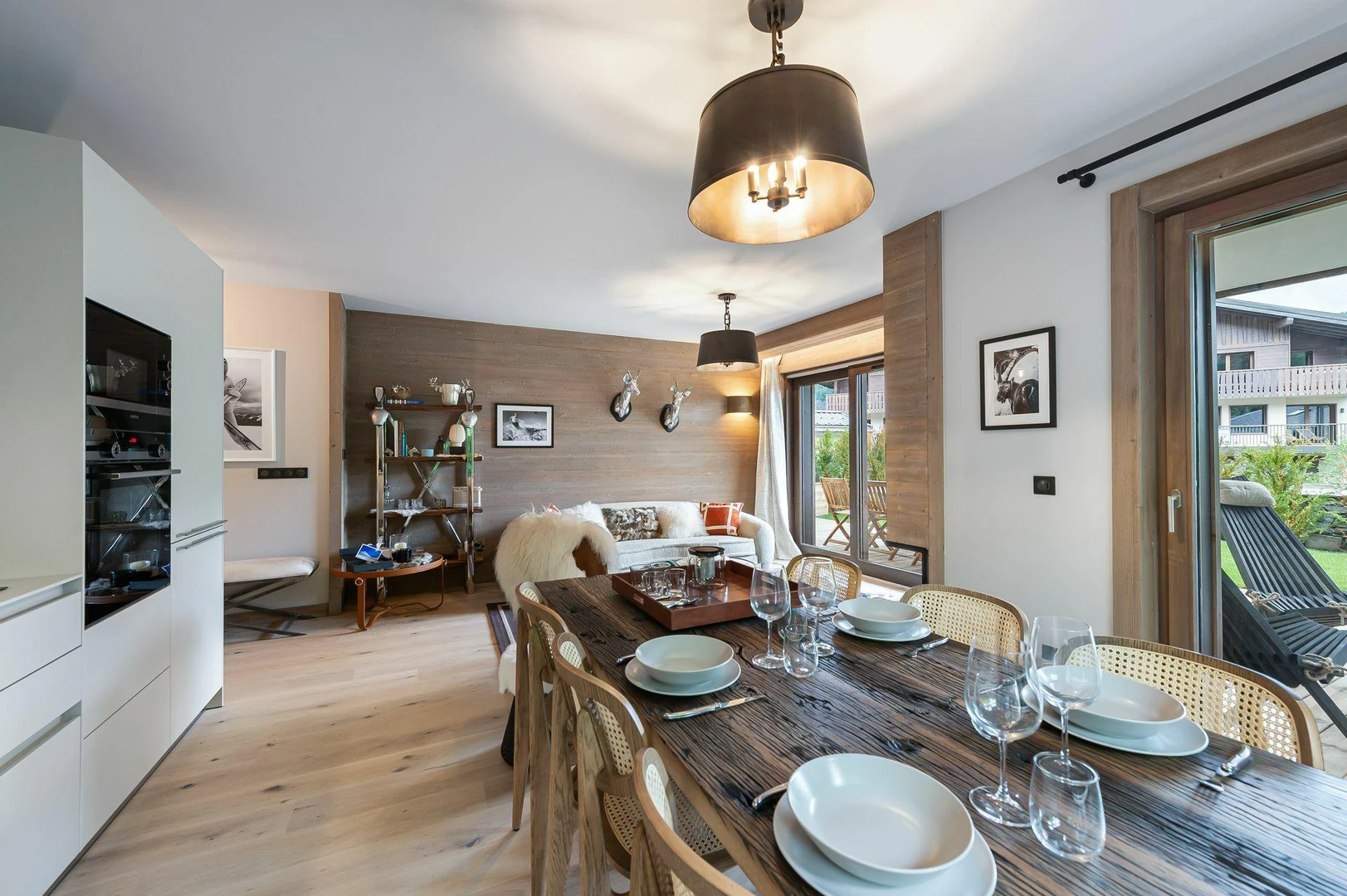 The apartment exudes a cozy, welcoming atmosphere, with a spacious living room illuminated by large windows that open onto a private garden. The open-plan kitchen flows into the dining area and living room, where a fireplace adds a touch of warmth. Step outside to a large, sheltered terrace equipped with an outdoor dining table and sun loungers, perfect for sunny lunches and relaxing afternoons.