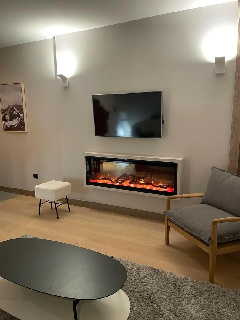 The Stallion A13 apartment accommodates 4 guests. It features a double bedroom, a children bedroom, a bathroom, and a separate toilet. The living room, designed with a fifties-inspired layout, invites relaxation with its cozy electric fireplace and a soothing color palette that complements the natural light streaming in. A terrace offers the perfect spot to bask in the sun and enjoy the scenic views.