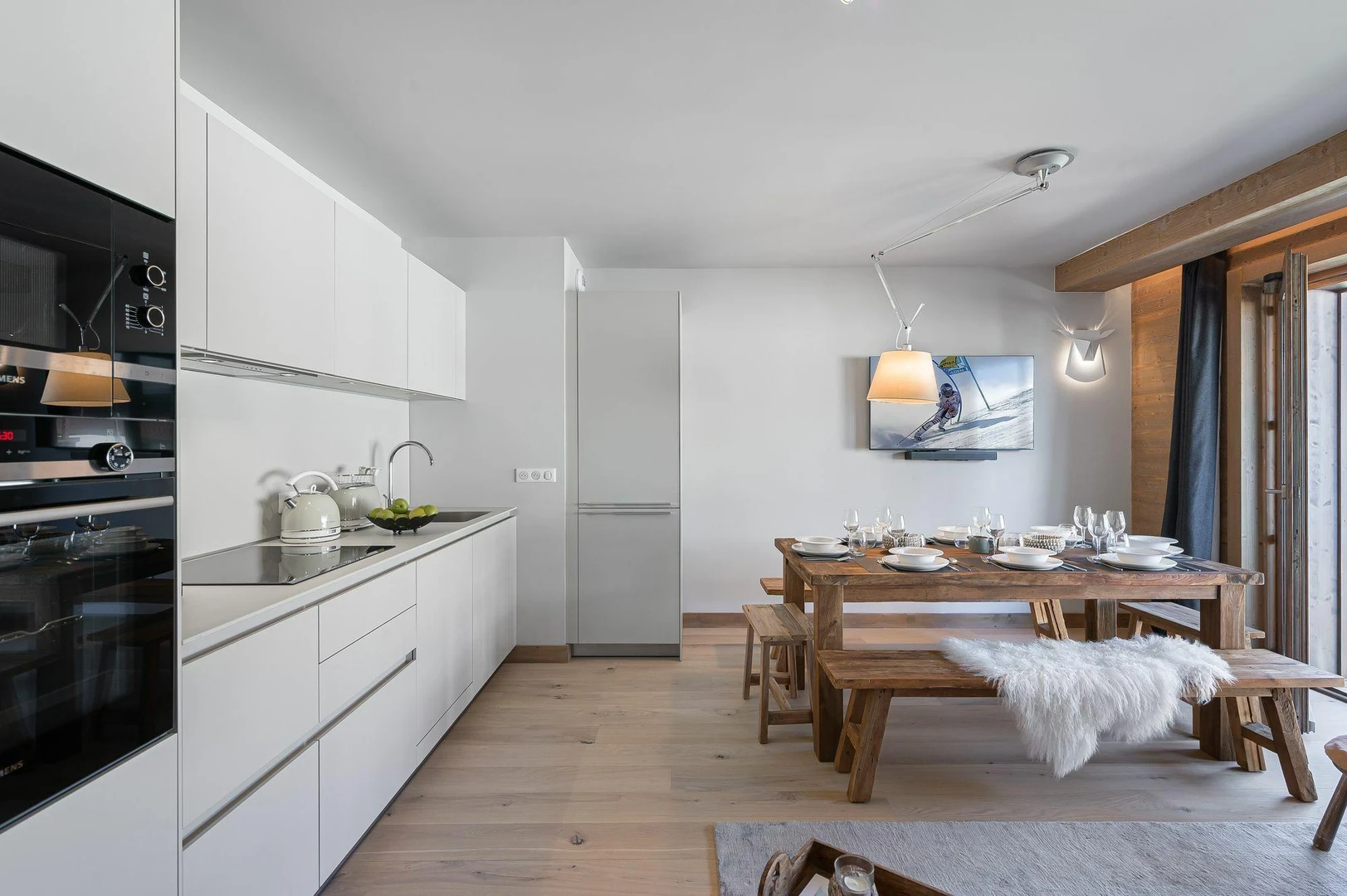 The bright, family-friendly living area opens onto a spacious balcony with stunning views over the Praz-sur-Arly valley, perfect for soaking up the afternoon sun. The open-plan layout blends a modern kitchen, a large wooden dining table, and a cozy sofa, creating an inviting space for relaxing and sharing special moments.