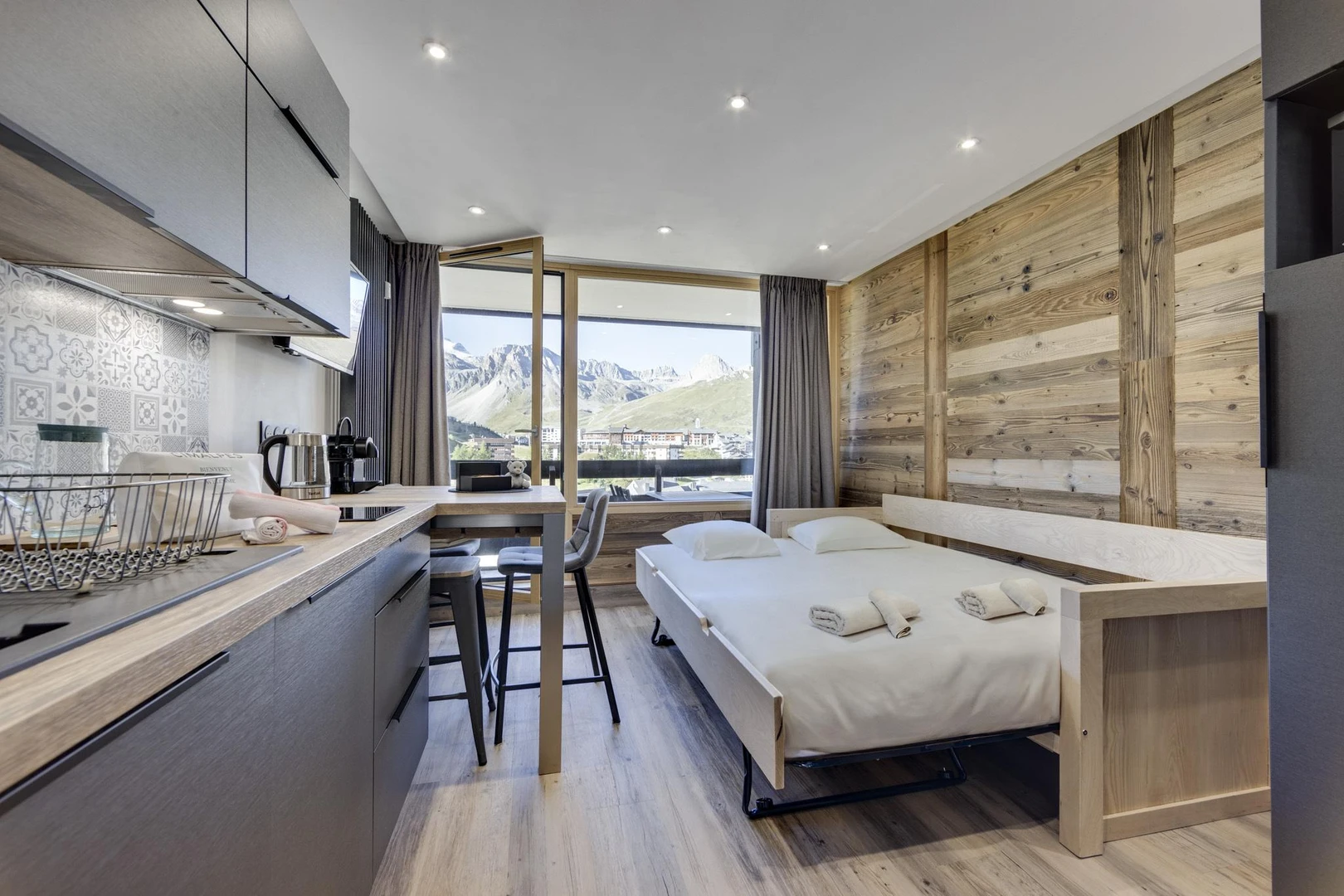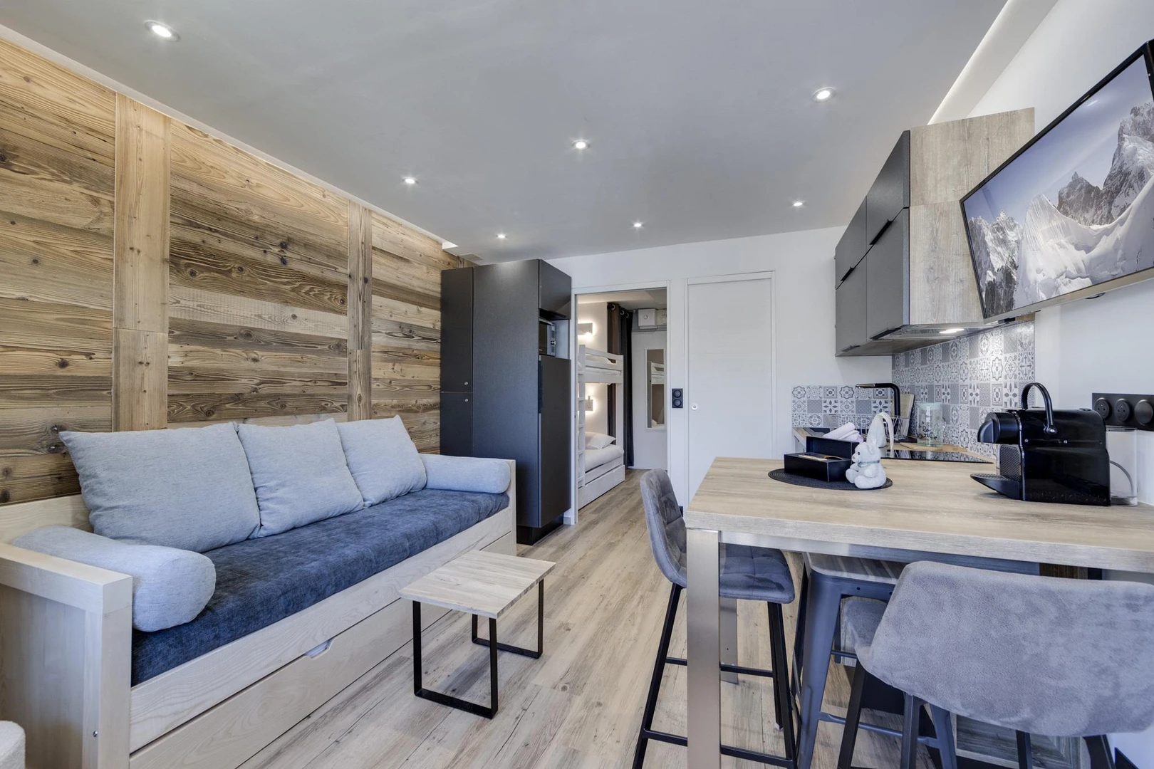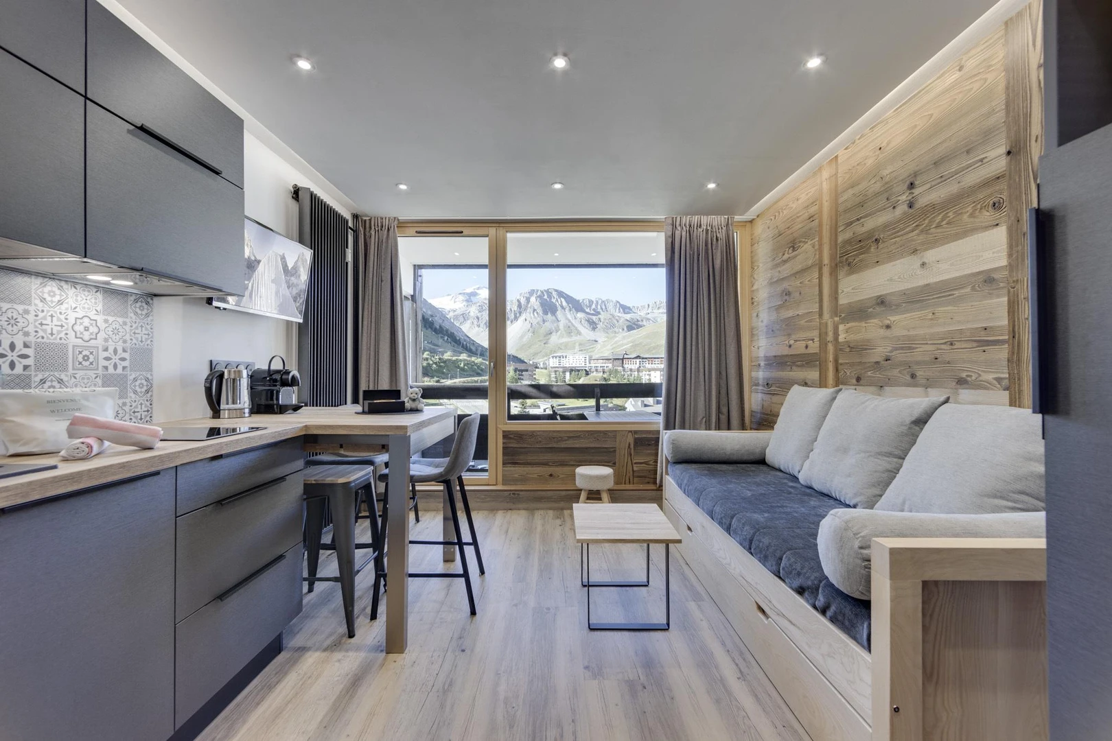 Ideal for up to 4 guests, it features two hallway beds and a comfortable sofa bed in the living area. Thanks to its southern exposure, the apartment is bathed in natural light throughout the day and offers stunning panoramic views of the iconic Grande Motte glacier.