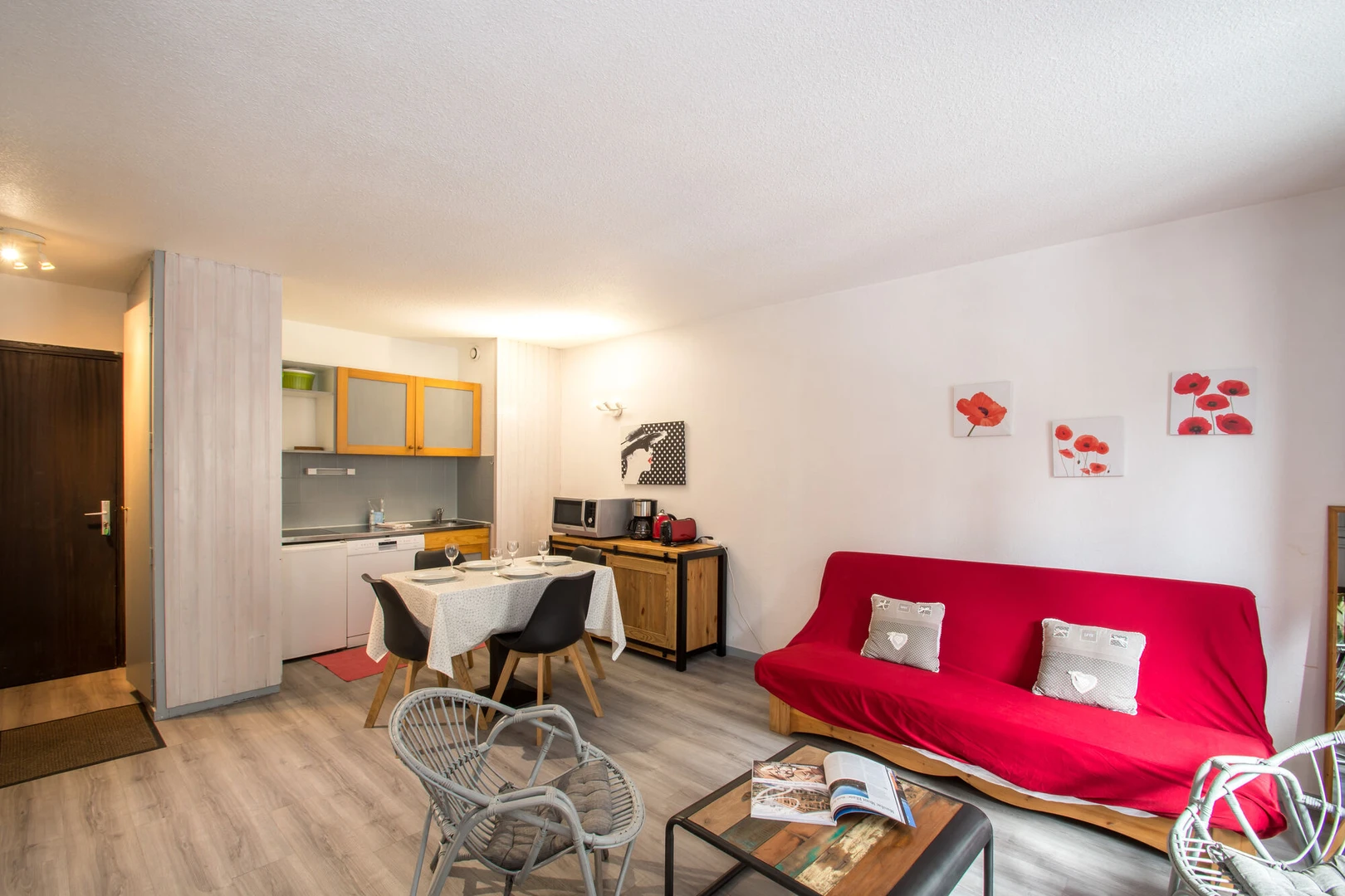 With a surface area of 36 sqm, this inviting apartment can accommodate up to 4 guests, featuring a double bedroom and an additional sleeping corner. The open-plan kitchen is fully equipped and connects to the bright living room, creating a welcoming space to relax after a day on the slopes or exploring Chamonix. A bathroom with a bathtub completes the layout, perfect for unwinding.