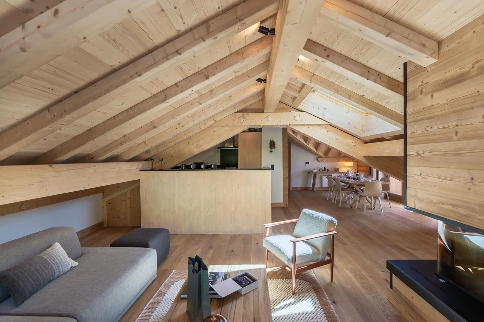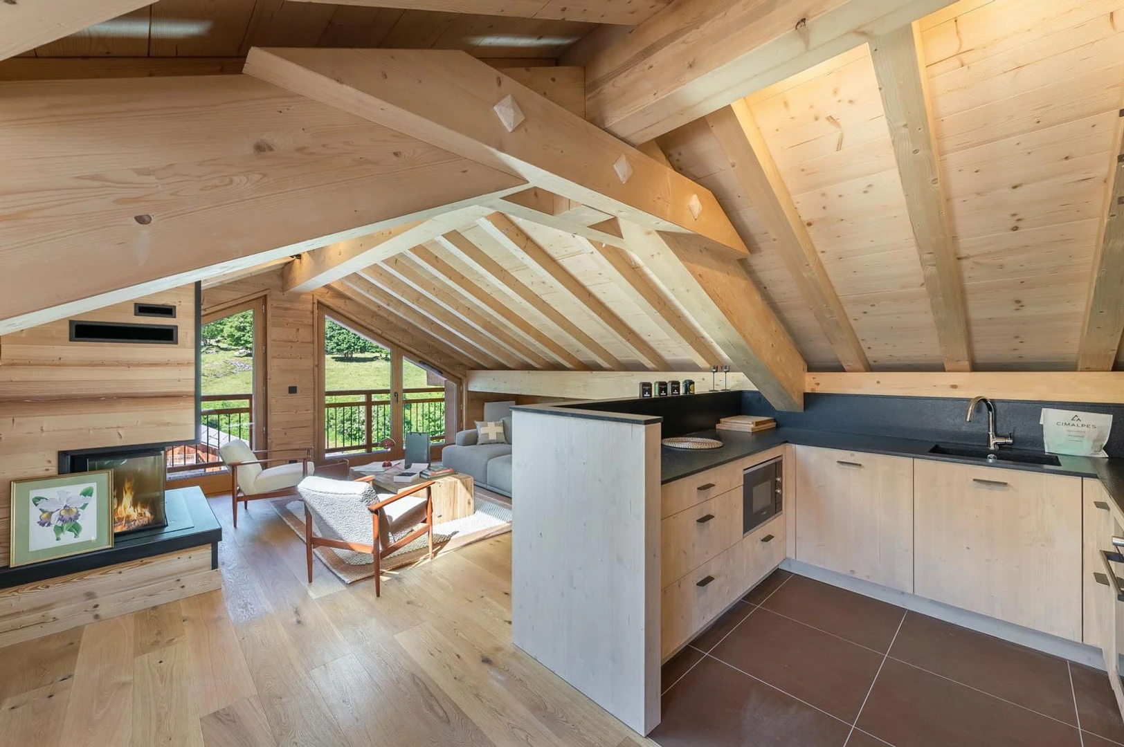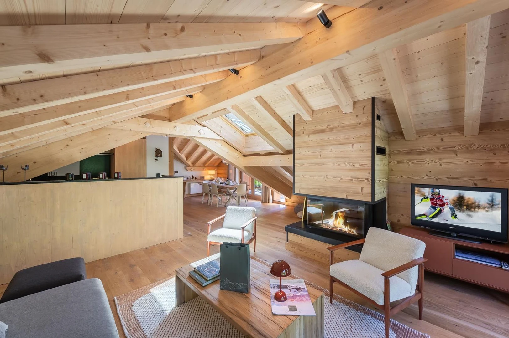 The upper level, set beneath the eaves, features a bright and airy living space designed for relaxation and connection. A sleek, fully equipped kitchen opens onto a spacious dining area and a cozy lounge centered around a warm fireplace. The combination of light wood finishes and contemporary decor creates a welcoming, alpine-chic ambiance.
