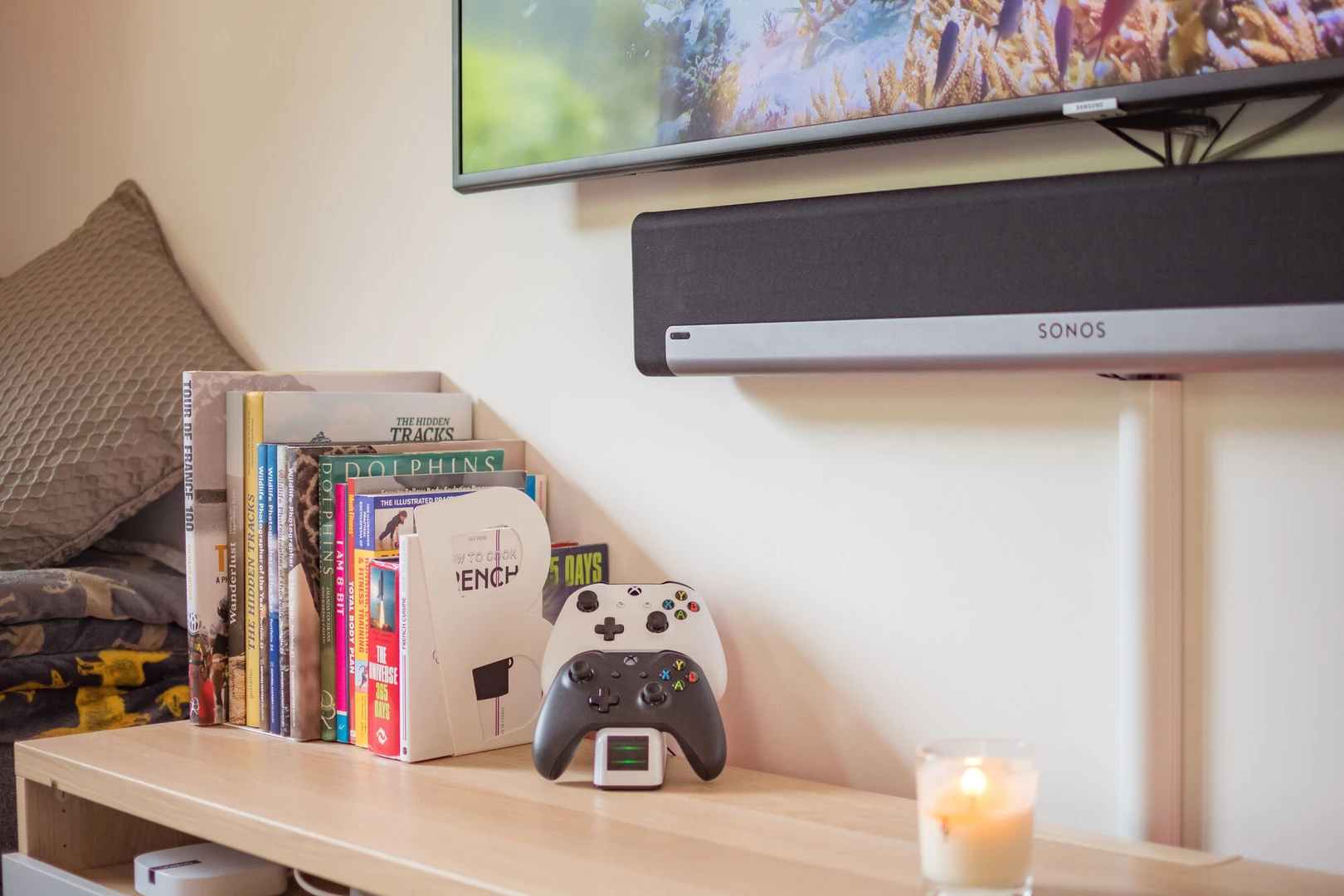One of the apartment’s standout features is its dedicated entertainment area, complete with a plasma screen TV, sound bar, Apple TV, and Xbox One,perfect for unwinding after a day on the slopes.