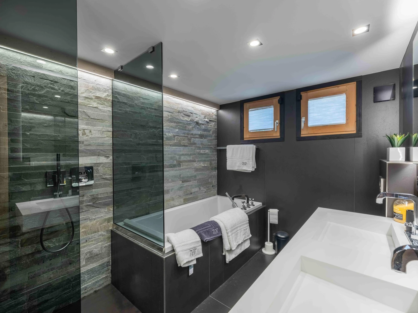 Spanning 330 sqm, the chalet comfortably accommodates 10 adults and 4 children across six en-suite bedrooms, including five elegant double rooms and a cozy dormitory for four.