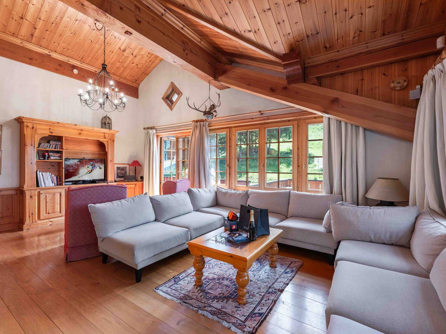 Inside, the chalet exudes rustic charm, with aged wood adorning the floors, walls, and ceilings. Natural light pours in through large glass openings, illuminating the spacious living area under high wooden beams.