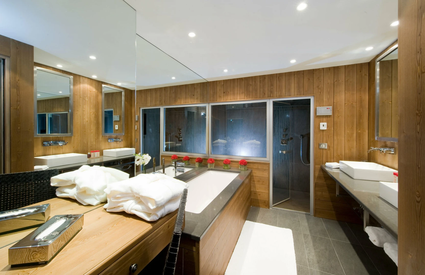 The other floors are home to four en-suite bedrooms, each designed with comfort and Alpine style. Each room boasts its balcony, letting in plenty of natural light. The master bedroom includes a luxurious bathroom with a hammam shower, perfect for unwinding after a day on the slopes. Additionally, an outdoor jacuzzi offers a private spot to relax and enjoy the surroundings.