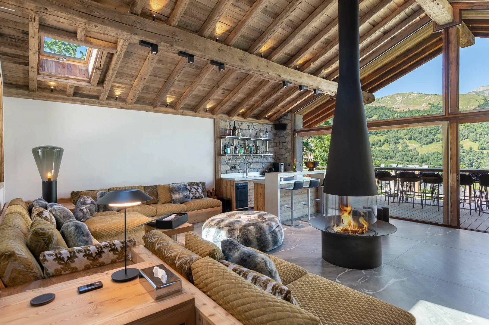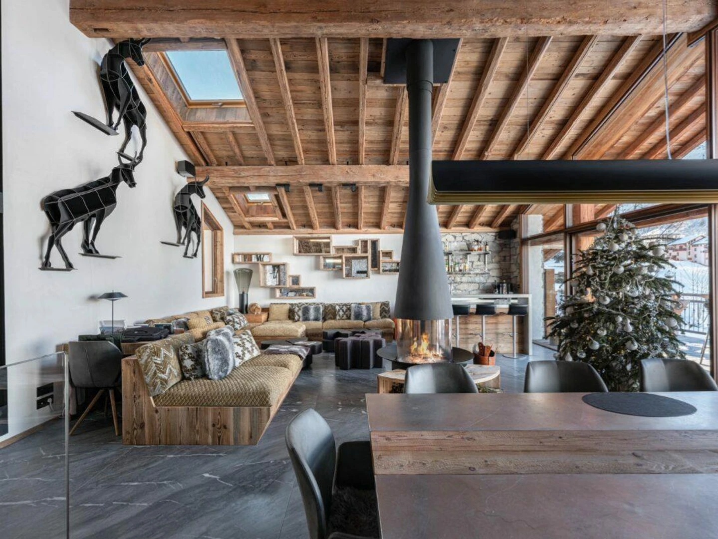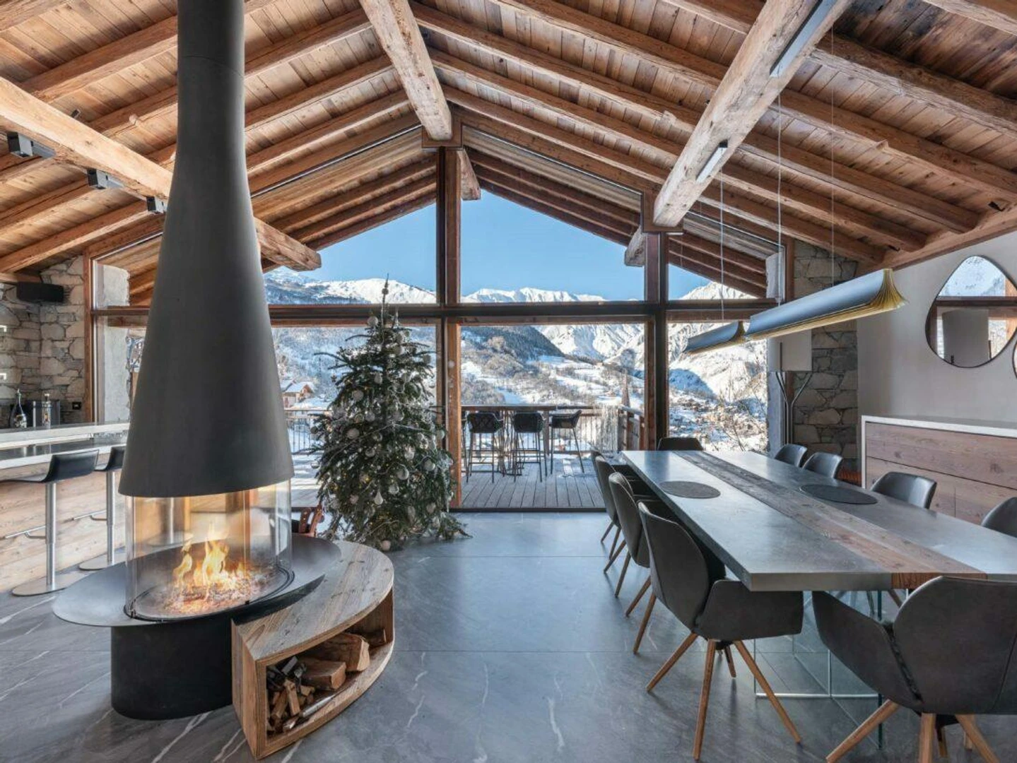 Spread across three levels, this elegant chalet features six uniquely styled en-suite bedrooms, comfortably hosting up to 12 guests. The spacious living area is designed to maximize the mountain vistas, with large bay windows, an oversized sofa, a bar, a dining area, and a semi-open kitchen. Contemporary design elements like a sleek fireplace and a steel staircase add a modern alpine touch.