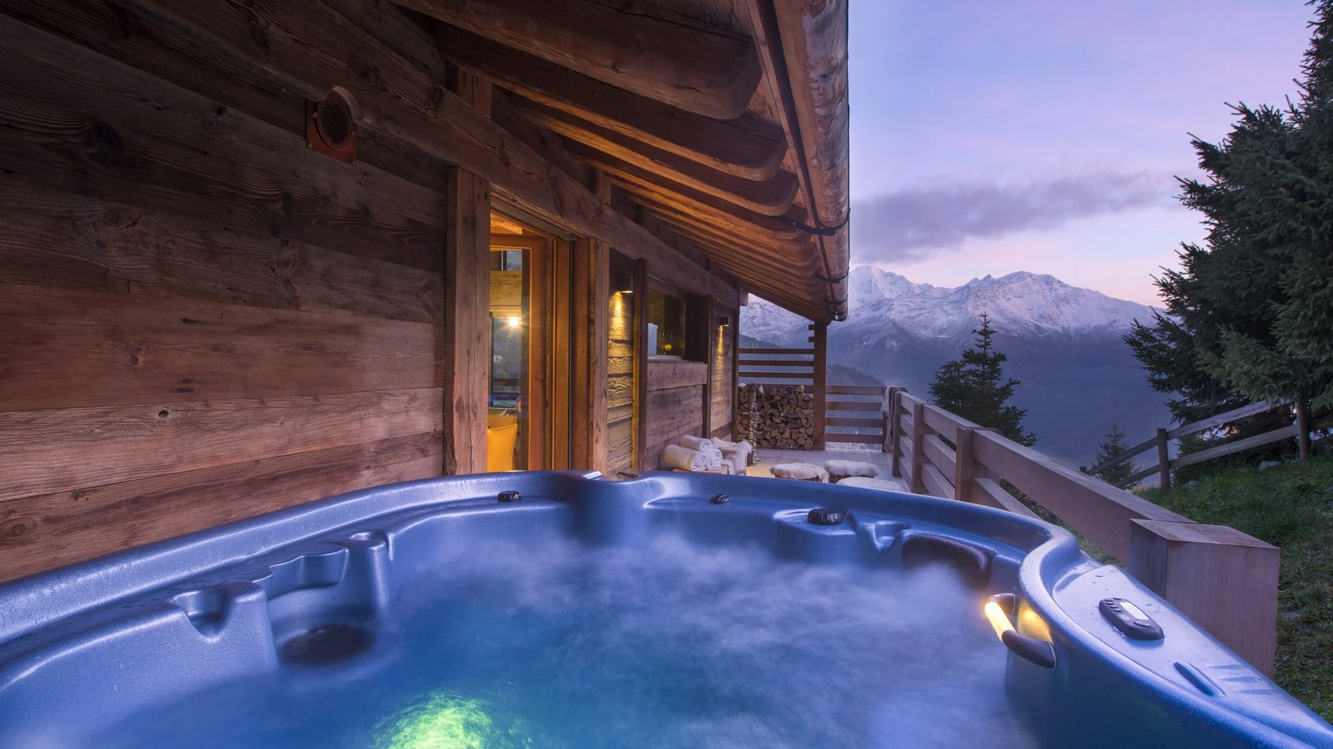 The chalet’s heart is its open-plan living and dining area on the second floor, where floor-to-ceiling windows frame dramatic mountain vistas. Guests can unwind beside the open fireplace or enjoy the sunset from the outdoor hot tub. A sleek, modern kitchen completes the space, ideal for preparing refined dinners. The chalet features a master suite with an en-suite bathroom, a twin/double room, a charming bunk room for children, and an additional double or twin room, all designed with comfort and alpine elegance in mind. Additional features include a hammam-style shower room, a chill-out mezzanine TV lounge, boot room with heaters, laundry facilities, and both indoor and outdoor parking.