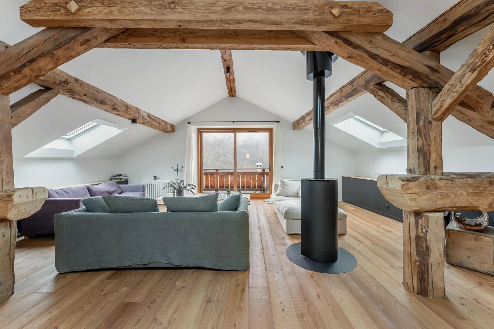 Spanning 190 m², the chalet accommodates up to 12 guests with 3 en-suite bedrooms and a dormitory with 6 beds. The top-floor attic living area features an open kitchen, dining space, and a cozy living room with a stove, all opening onto a terrace with stunning village and mountain views.