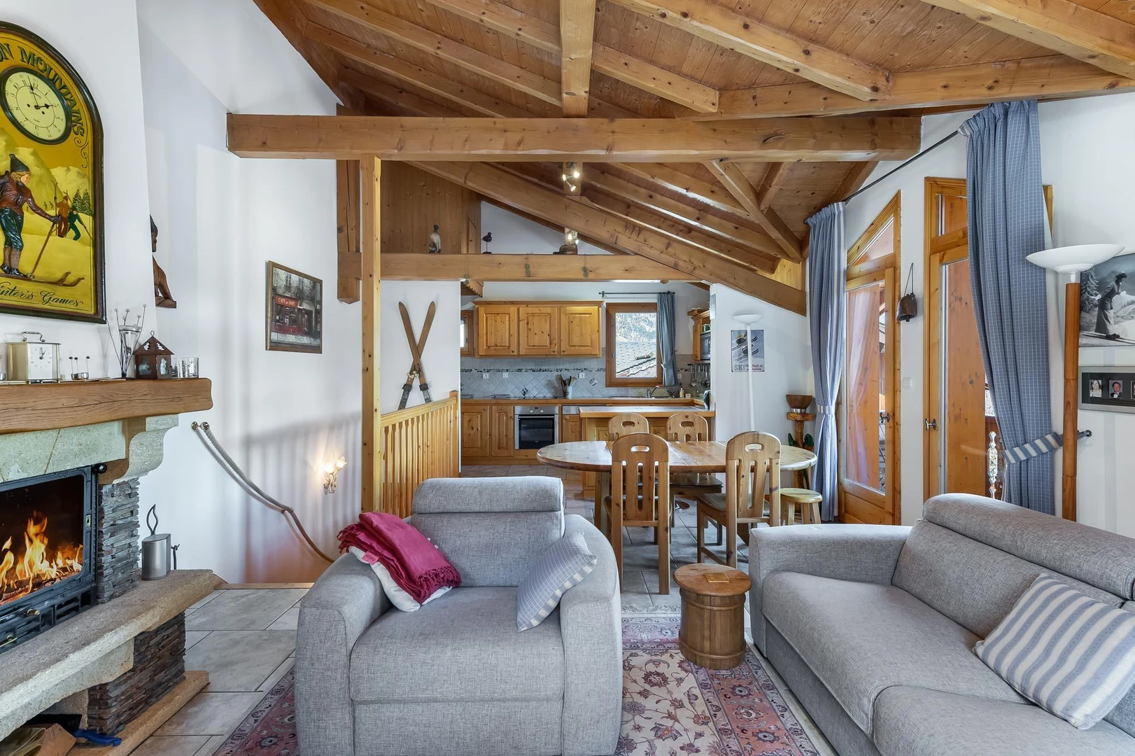 The chalet features 4 en-suite bedrooms, a fully equipped open kitchen, a dining area, and a living room with a fireplace, perfect for unwinding while enjoying views of the Olympic Tremplins and Eclipse piste.