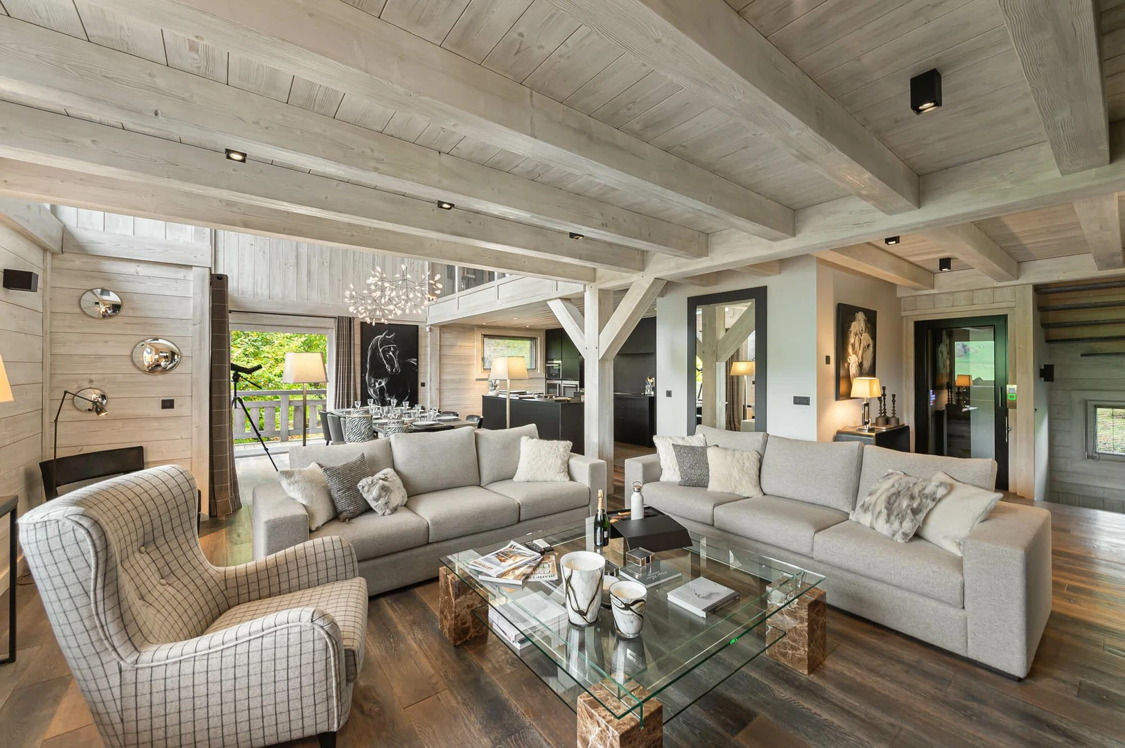 Chalet Eagle is a stunning retreat located in the tranquil, private area of La Princesse, just a short drive from the heart of Megève. Blending traditional alpine architecture with contemporary elegance, the chalet's light grey wood and stone exterior perfectly mirror the refined interior. Inside, soft tones of grey dominate, enhanced by darker accents like black, creating a harmonious and sophisticated ambiance. The use of light wood throughout the chalet adds warmth and serenity to the space.