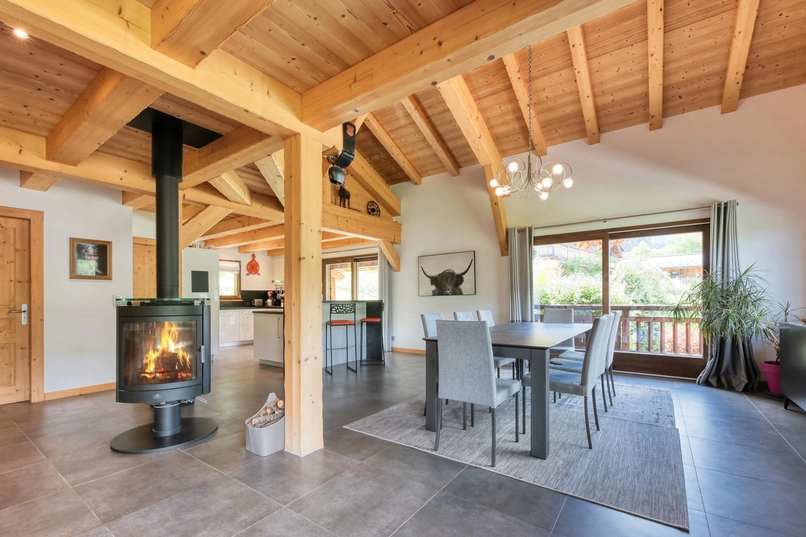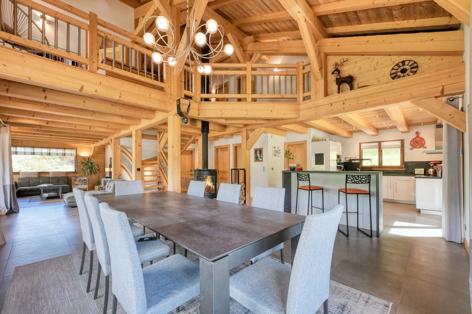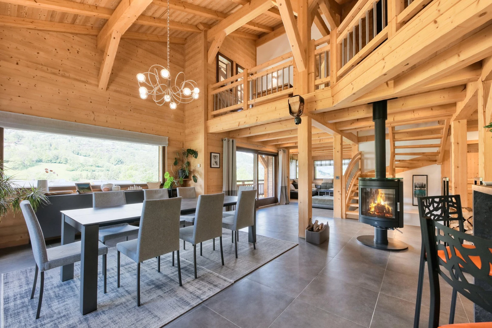 Designed with a blend of modern style and alpine charm, the chalet boasts exposed wooden beams, high ceilings, and large windows that flood the living room with natural light. The central pivoting wood-burning stove creates a cozy atmosphere, while the open-plan kitchen, dining, and lounge areas provide an ideal space for gathering. A utility room and mezzanine complete its thoughtful layout.