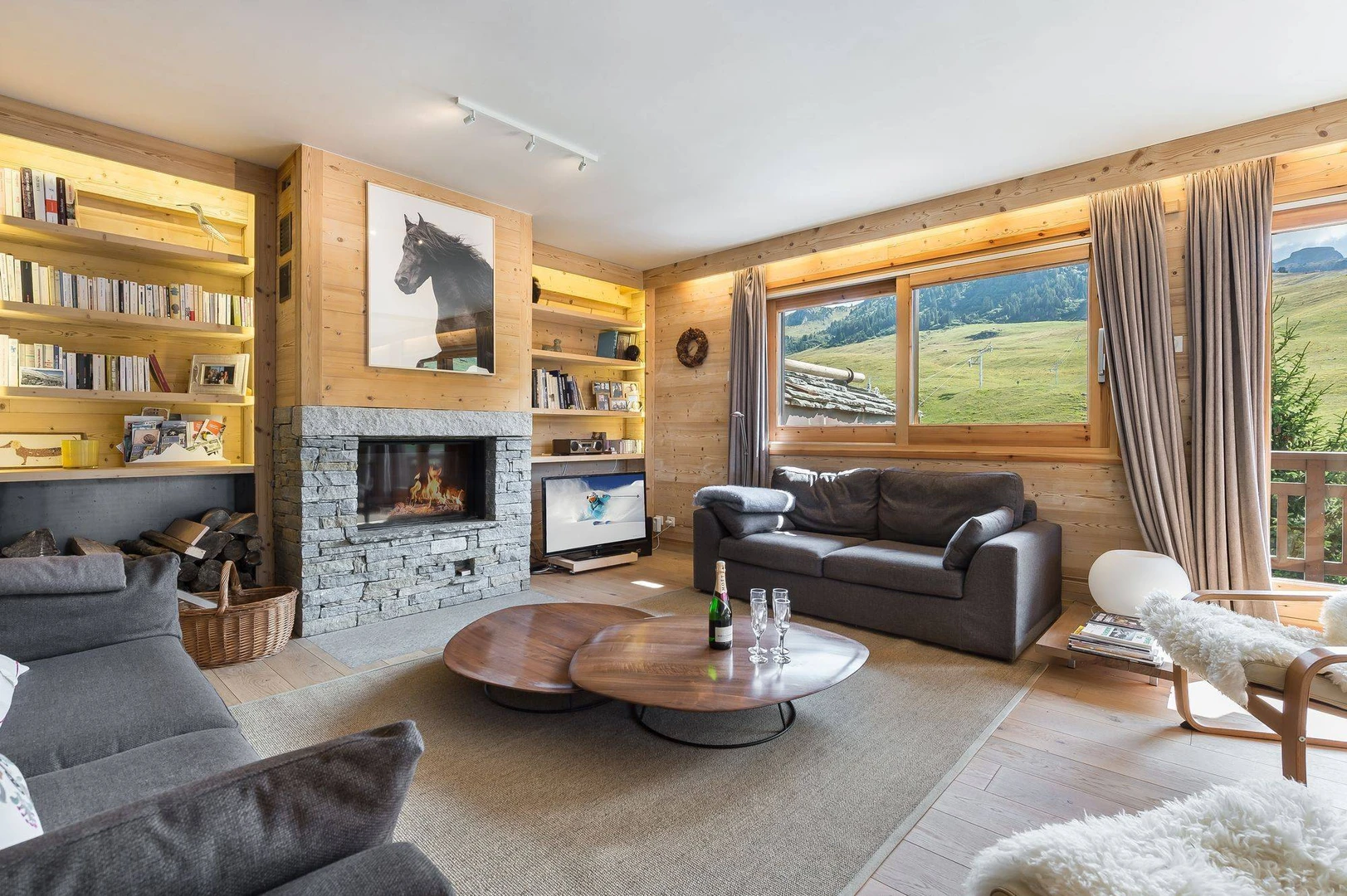 The bright living area features a cozy fireplace, semi-professional kitchen, and panoramic terrace, creating the perfect space for relaxing after a day of skiing.