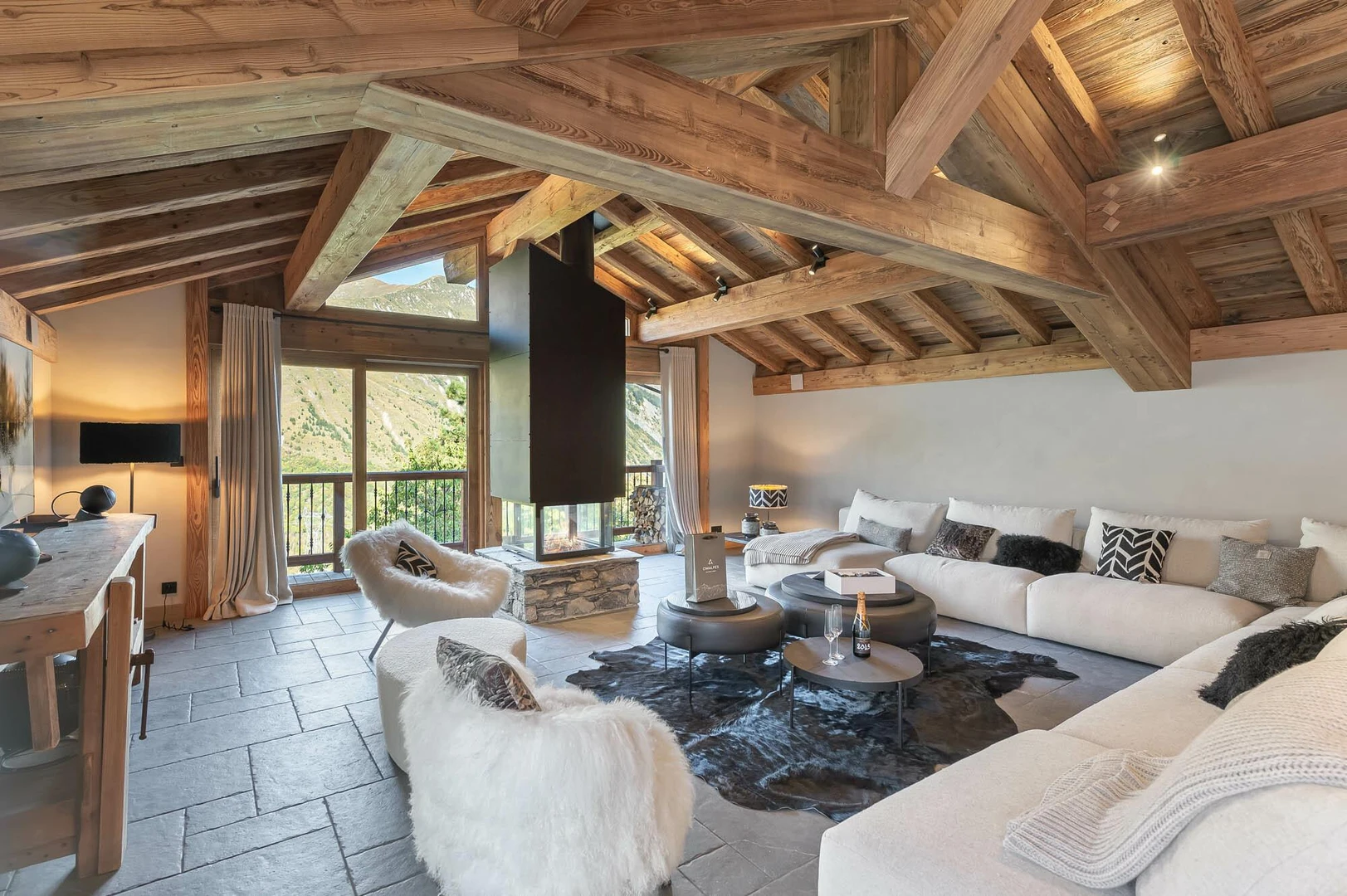 Inside, you’ll find six spacious en-suite bedrooms, a generous living area with a central fireplace, and an elegant dining space ideal for gathering after a day on the slopes. For relaxation, the chalet features a private wellness area with an indoor pool, sauna, and hammam, offering the ultimate après-ski experience. Its prime location near Place de l’Église and just a short walk from the ski lifts of the 3 Vallées ensures both tranquility and easy access to the heart of the village. A free shuttle service also stops right at the door, adding comfort and convenience.
